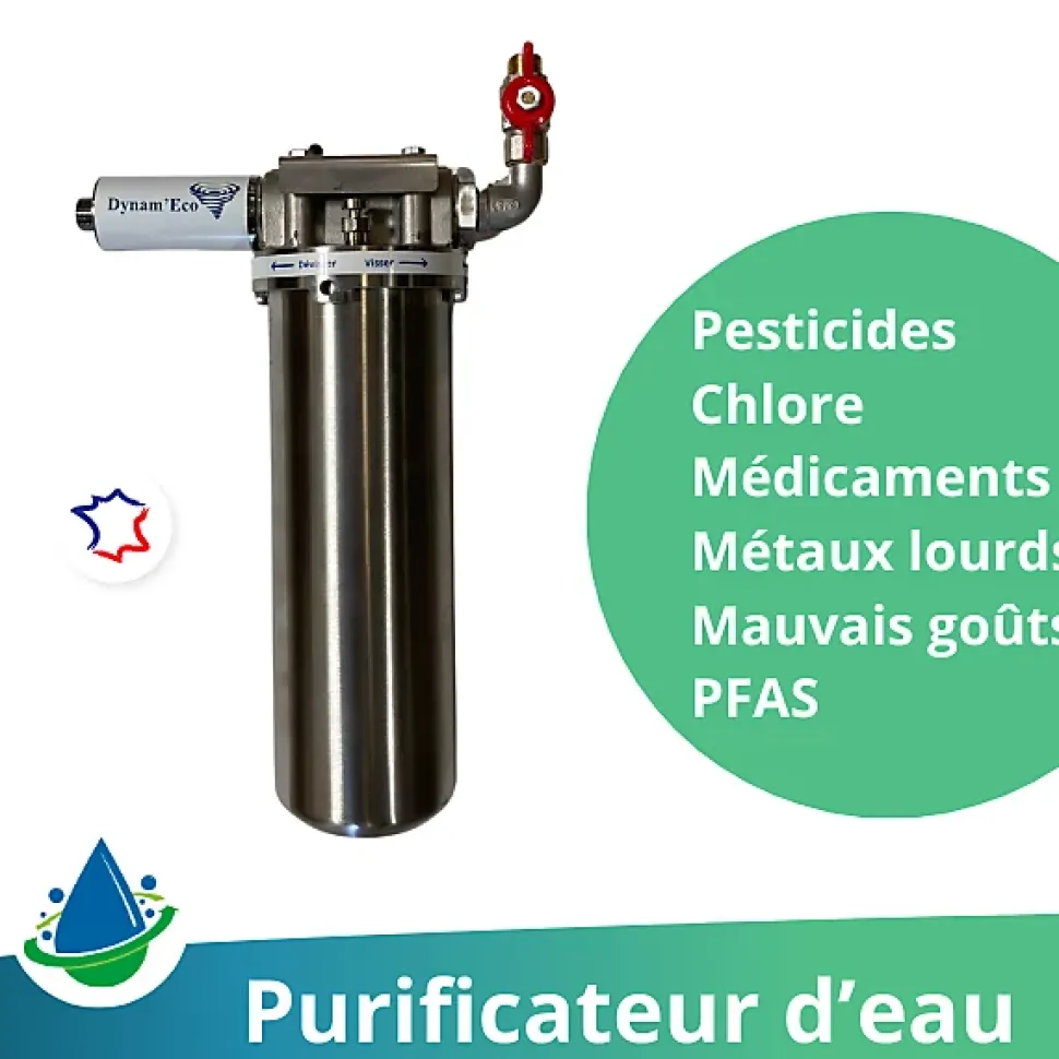 Une eau exceptionnelle au quotidien !Le purificateur Dynam’Eco élimine efficacement mauvais goûts, chlore, pesticides, métaux lourds et résidus de médicaments, assurant une eau saine et délicieuse à chaque utilisation.1 – Eau purifiéeOffre une filtration de haute performance qui assure une qualité d’eau parfaite pour boire et cuisiner. -> Elimine les contaminants -> Conserve les sels minéraux -> Dynamise l’eau2 – Installation facileConçu pour une mise en oeuvre aisée sous l’évier, sans travaux, ni coûts additionnels. -> Installation en 5 minutes -> Entretien simple -> Grande durabilité3 – Contribution à la protection de la planèteRéduit la consommation de bouteilles plastiques, favorisant un mode de vie plus durable. -> Moins de déchets -> Economies substantielles -> Préservation de l’environnementNotre système de filtration utilise une cartouche charbon-KDF 55 composée de charbon actif et d’un mélange de cuivre et de zinc pour éliminer le chlore, les métaux lourds et autres contaminants. L’eau filtrée est ensuite dynamisée par un vortex, la rendant légère et agréable à la dégustation.Entretien : Remplacement de la cartouche filtrante tous les 6 mois pour maintenir son haut pouvoir de filtration.Dimensions (H x L x P): 340 x 230 x 120mmContient: – 1 purificateur d’eau en inox avec 1 cartouche charbon-KDF – 2 flexibles de raccordement de 80 cmEntrée et sortie en 3/8 pouce