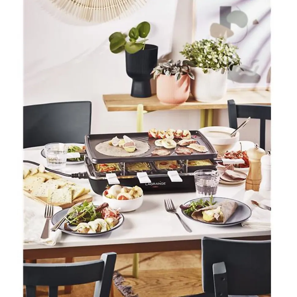 Service à raclette Élément 8 personnes avec fonctions gril et crêpe (1 empreinte) – Vivez des soirées conviviales et variées, en toute sécurité, grâce à sa résistance aux projections d’eau et intempéries (norme IPX4) – 8 poêlons profonds avec revêtement antiadhésif – Plaque amovible avec côté grill et 1 empreinte à crêpe – Socle en thermoplastique et platine en inox – Interrupteur marche/arrêt avec voyant lumineux et cordon alimentation amovible de 2 mètres – Patins anti-dérapants – Coloris Noir – Puissance 1200 W – Garantie 2 ans + 1 an offert sur simple inscription sur le site Lagrange – Fabriqué en France.