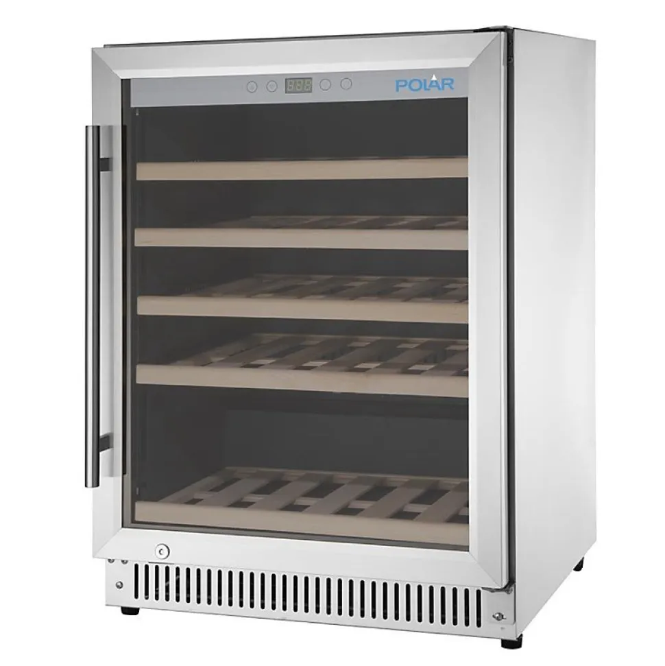Rafraîchisseur à Vin Dessous de Comptoir en Inox Série G 51 Bouteilles Rafraîchisseurs efficaces et peu bruyants à thermostats réglables, portes réversibles et pieds réglables pour une flexibilité optimale lors de l’installation (ne conviennent pas pour le vin rouge). CE203 et CE204 disposent d’un éclairage intérieur pour une mise en avant. _ 150W. Peut contenir jusqu’à 51 bouteilles _ 820(H) x 595(L) x 580(P) mm _ 51 bouteilles de style Bordeaux de 750ml _ Construction robuste et facile à nettoyer en acier inoxydable _ Refroidissement assisté par ventilateur assurant une température interne constante _ 5 étagères en bois _ Le dégivrage automatique maintient l’efficacité et la performance _ Contrôleur numérique tactile convivial avec affichage LED _ Isolation de 40mm améliorant l’efficacité de refroidissement