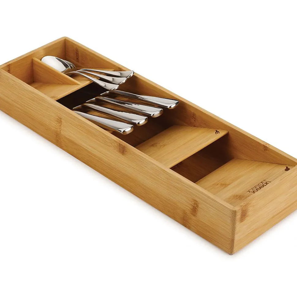 Aspect : Coloris = Bambou • Matériau principal = Bambou • Matériaux secondaires = Silicone • Dimensions : Hauteur (en cm) = 6 • Longueur (en cm) = 12,20 • Profondeur (en cm) = 39,80 • Autres caractéristiques : Informations complémentaires = Compartiments individuels empilables pour différents types de couverts , Icônes permettant d’identifier facilement le type de couverts , Pieds antidérapants , Adapté aux tiroirs de 8 cm de haut minimum , Huiler régulièrement avec une huile alimentaire pour un entretien optimal • Poids (en kg) = 0,46 • Range couverts compact DrawerStore Bamboo