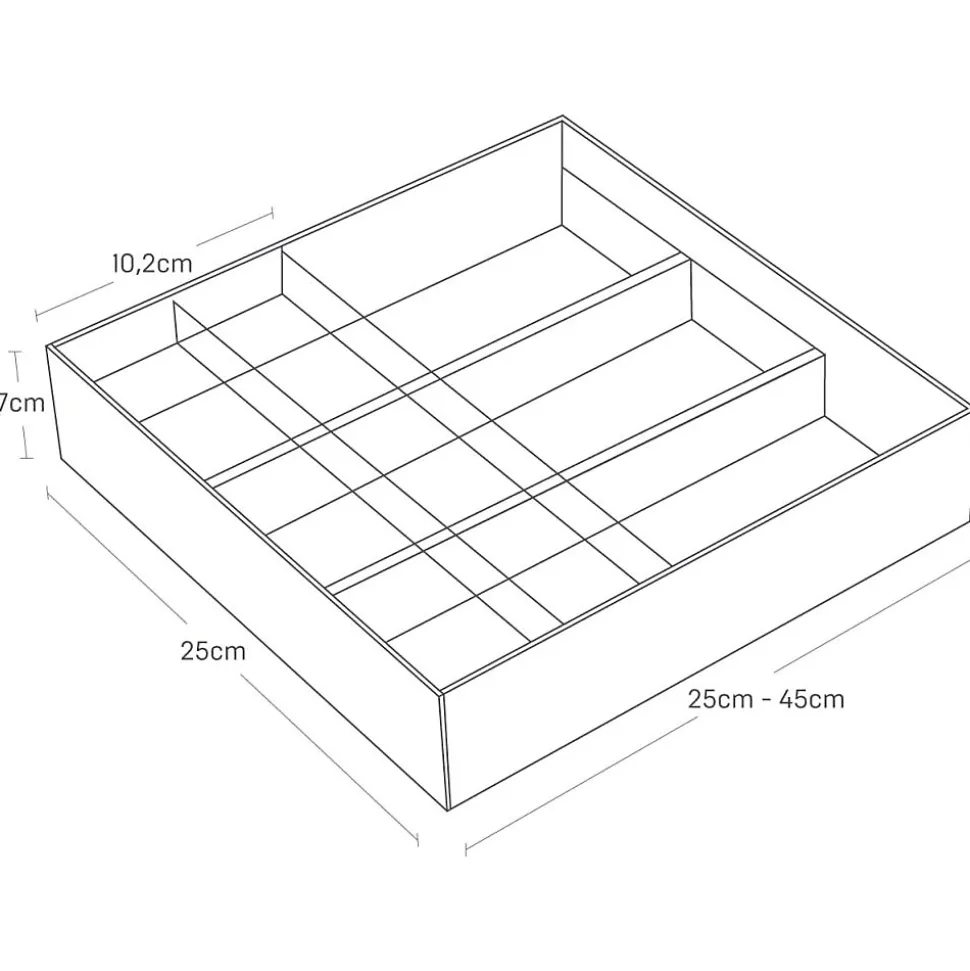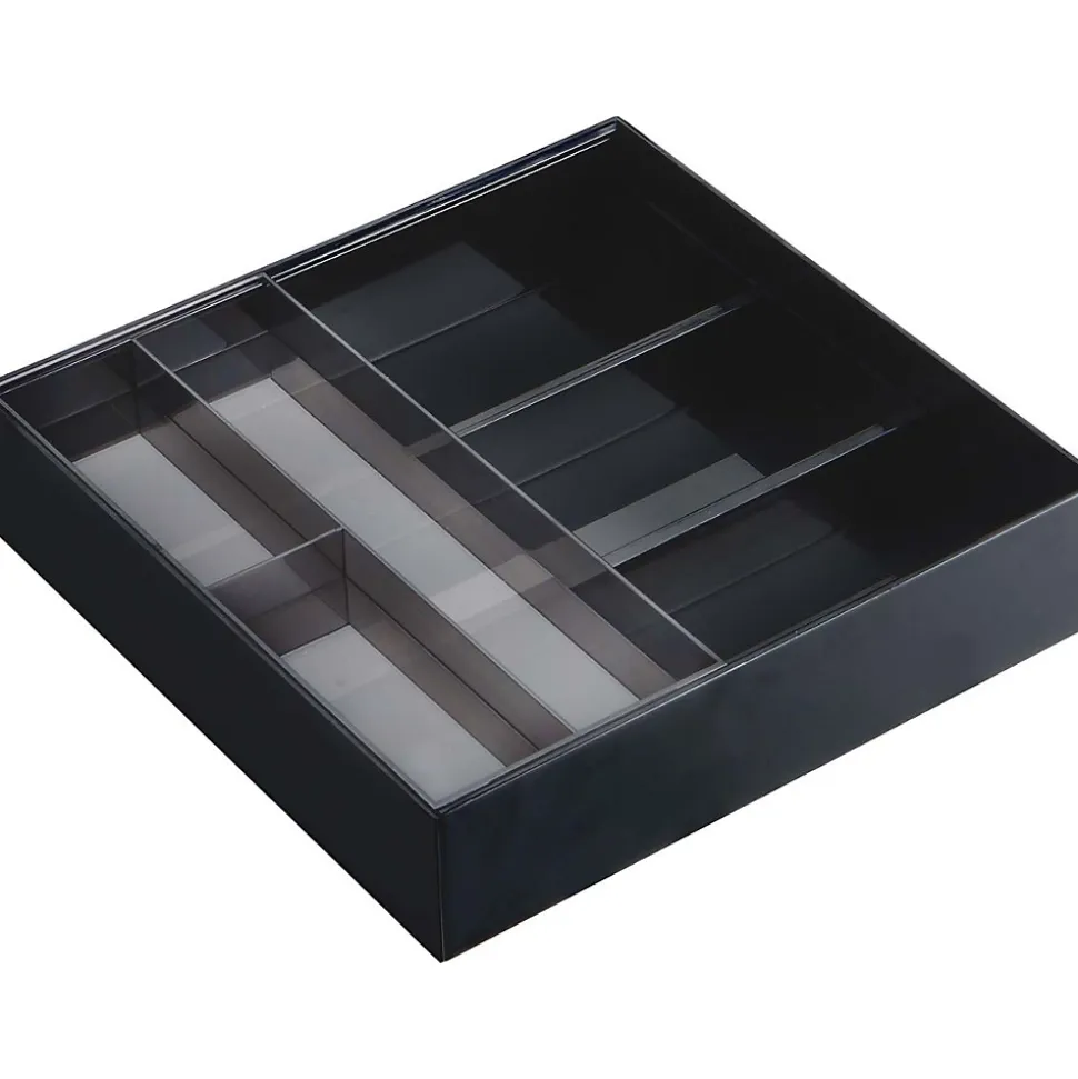 Aspect : Coloris = Noir • Matériau principal = ABS • Matériaux secondaires = Résine • Dimensions : Hauteur (en cm) = 5,70 • Longueur (en cm) = 25 • Profondeur (en cm) = 24,60 • Autres caractéristiques : Informations complémentaires = Extensible : de 24.6 à 45 cm de longueur , Contenant supérieur amovible • Poids (en kg) = 0,75 • Range couverts extensible Tower