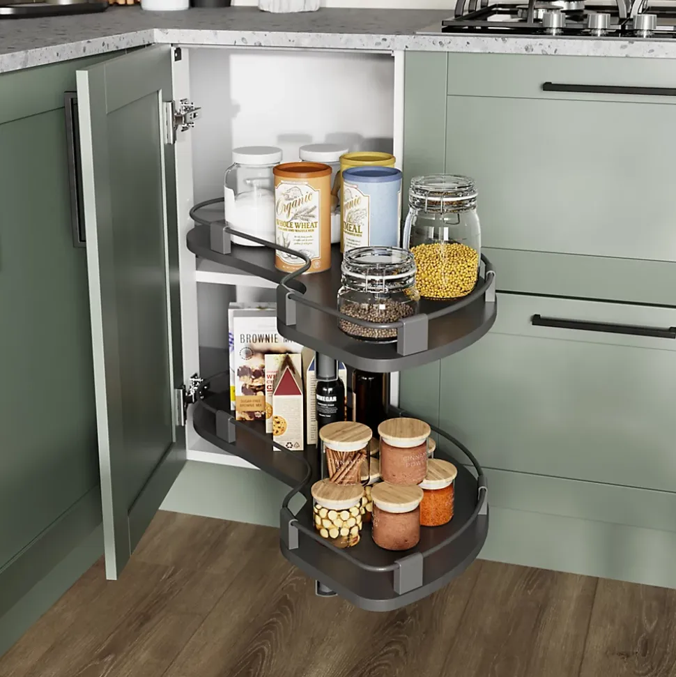 - Conçu pour optimiser les espaces de rangement dans les angles de la cuisine, il permet d’accéder aux zones les plus difficiles