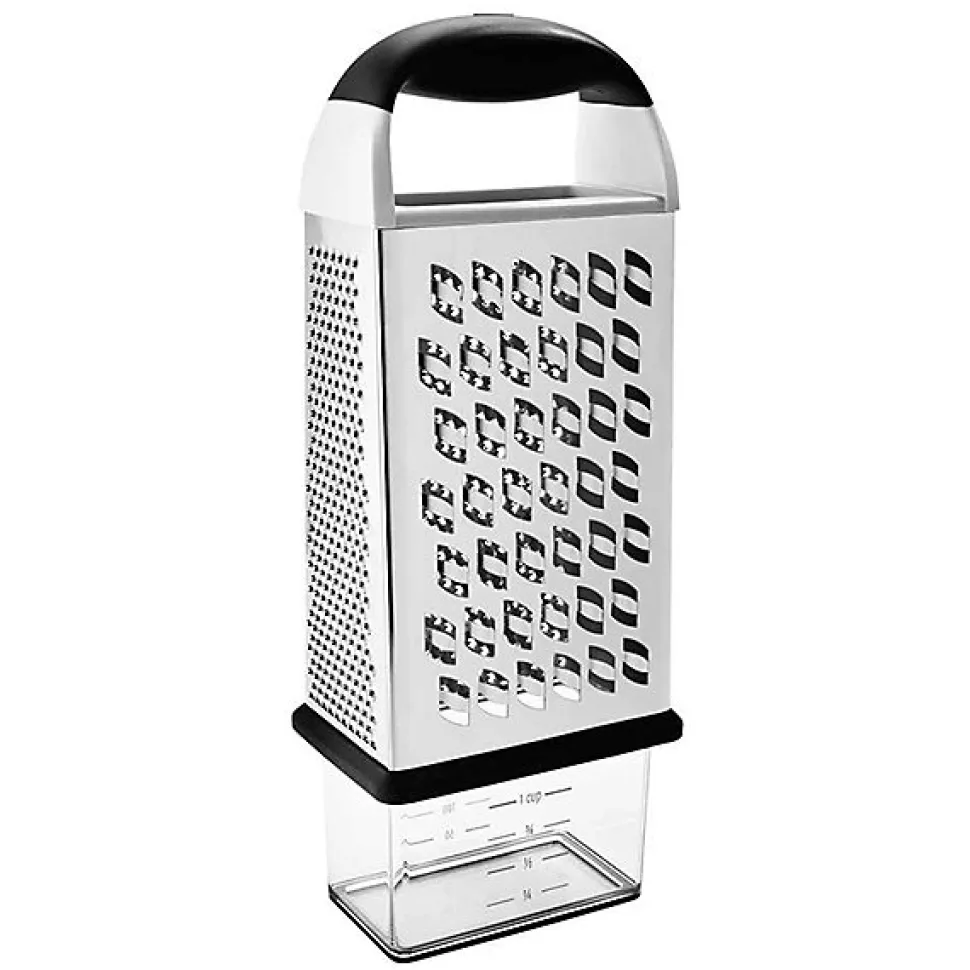 Râpe 4 faces avec récipient Oxo – La boîte à râpe 4 faces est munie d’un réceptacle gradué et d’un couvercle pour permettre une meilleure conservation des aliments râpés. – Boîte à râpe 4 facesPoignée en santoprène ant-glisse et anti-fatigueLames différentes pour râper grossièrement, finement ou très finementRécipient pour recevoir, mesurer et conserver les ingrédients râpésPasse au lave-vaisselle