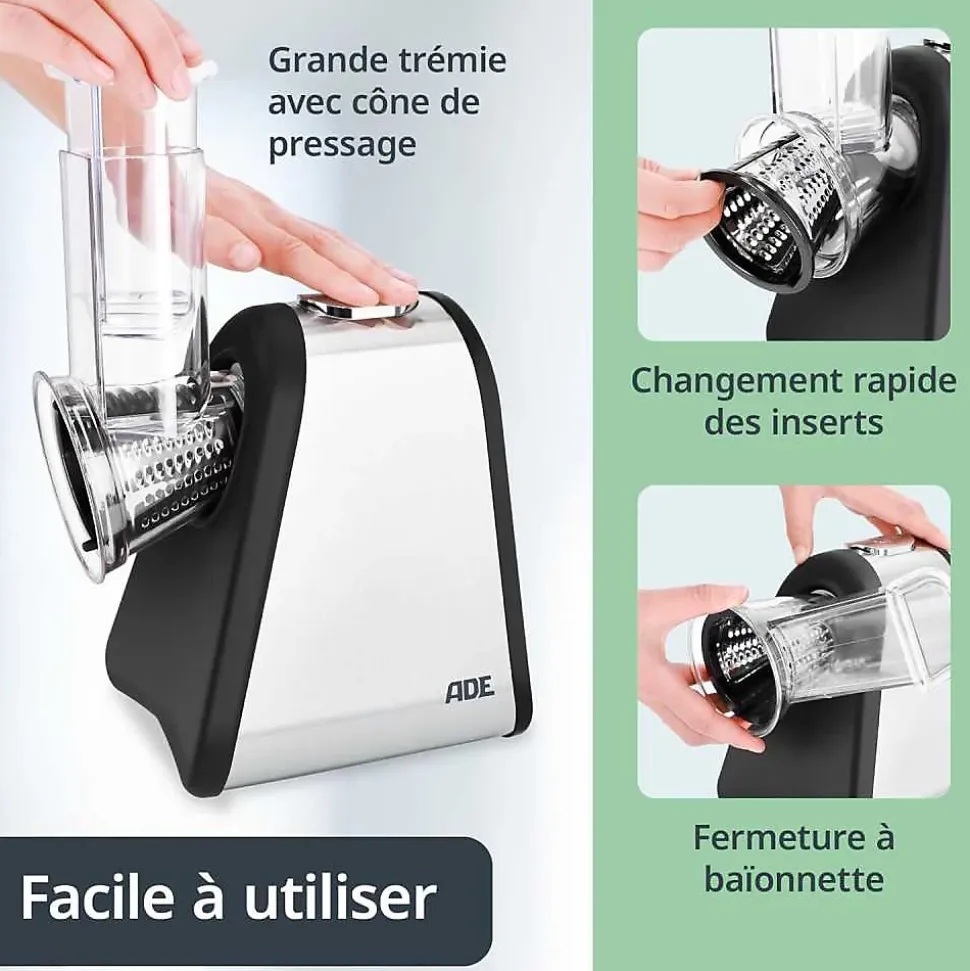 Râpe électrique ADE 200 W avec 4 inserts interchangeables en acier inoxydable (râpe grossière, 2 râpes fines et rabot), boîtier compact à panneaux aspect inox, trémie large avec cône poussoir transparent, pieds antidérapants et rangement du câble. Parties amovibles compatibles lave‑vaisselle. Usage polyvalent pour chocolat, noix et légumes ; pause de refroidissement recommandée après environ 3 minutes d’utilisation continue.
