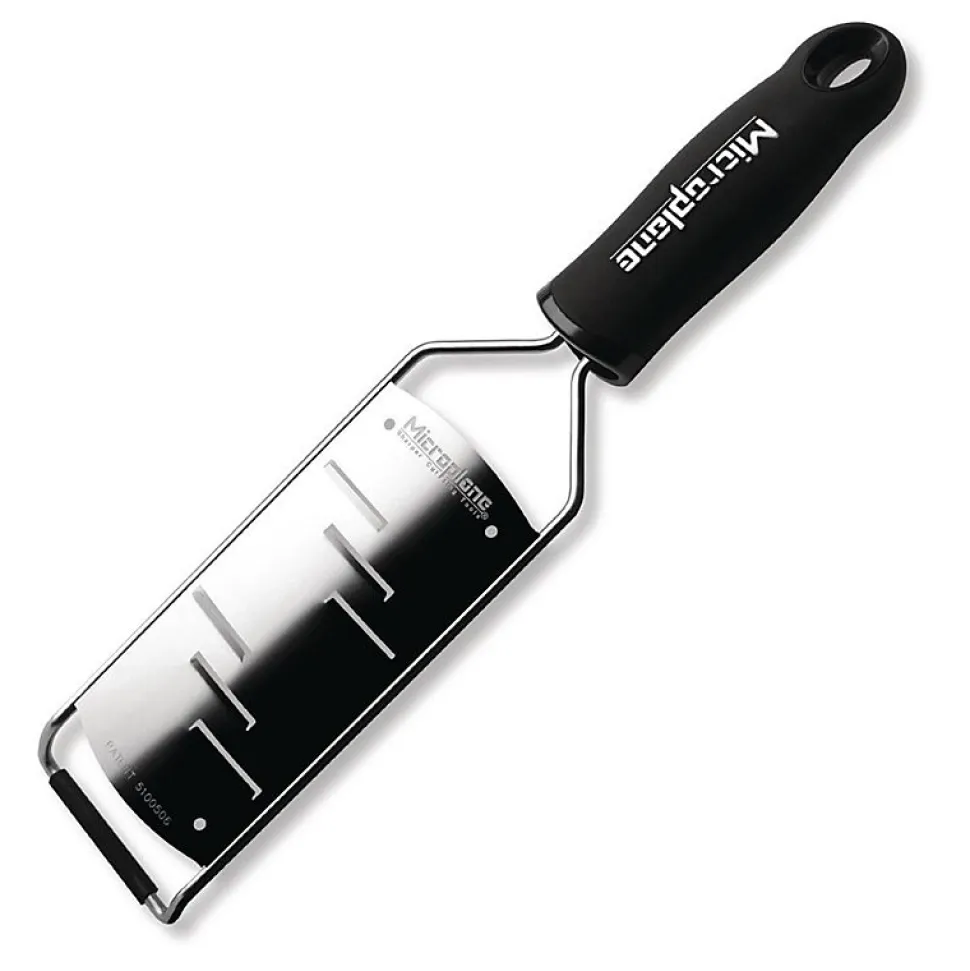 Râpe gourmet rasoir de coloris noir Créez de beaux plats aux textures uniques, grâce à la râpe Gourmet rasoir Microplane. Fabriqué avec une lame en acier inoxydable incroyablement tranchante, l’ustensile crée facilement des copeaux parfaits pour vous aider à produire des plats avec une saveur et une présentation exceptionnelles. La lame reste également tranchante plus longtemps, ce qui maintient le rasoir en excellent état de fonctionnement et vous empêche d’acheter des produits de rechange. Une poignée de conception ergonomique vous offre également un confort supplémentaire pour vous aider à effectuer des tâches de longue haleine. Cet outil pratique est parfait pour ajouter des copeaux de parmesan ou de chocolat à vos plats.Caractéristiques techniques :Dimensions: 320(H) x 70(L) x 20(P) mmMatériel: InoxPoids: 300 gLame en acier inoxydable durableManche ergonomique au toucher douxExtrémités en caoutchouc antidérapantPossibilité de fixer un curseur pour protéger les doigtsLavable au lave-vaisselleHousse de protection réutilisableSurface de râpe exacte : 126 x 60 mmSept styles de lames uniques disponibles dans cette série