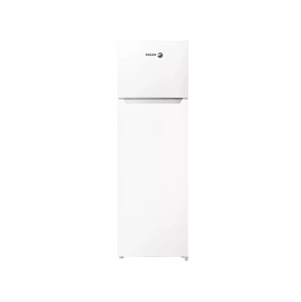 Réfigérateur combiné 54cm 261l statique blanc Fagor – Réfigérateur combiné FDP261EW de Fagor – Type de produit : Réfrigérateur 2 portes.Type de construction : Pose libre.Volume total (L) : 261.Classe d’efficacité énergétique : E.Emissions de bruit acoustique dans l’air (dB(A)) : 39.Classe d’émission de bruit acoustique dans l’air : C.Conso. d’énergie annuelle (kWh/an) : 189.Classe climatique : N-ST. Cet appareil est conçu pour être utilisé à une température ambiante comprise entre 16°C et 38°C.Réglage hiver : Non.Volume compartiment réfrigérateur (L) : 209.T°C recommandée pour stockage optimisé des denrées alimentaires fraîches (°C) : 4.Mode de dégivrage réfrigérateur : Manuel.Volume compartiment congélateur (L) : 52.T°C recommandée pour stockage optimisé des denrées alimentaires dans compartiment 4 étoiles (°C) : -18.Mode de dégivrage congélateur : Manuel.Pouvoir de congélation spécifique (kg/24h) : 2.5.Autonomie (h) : 8.Régulation de la température : Mécanique.Réfrigérateur connecté : Non.Dispositif de congélation rapide : Non.Type de dégivrage : Manuel.Type de froid du réfrigérateur : Statique.Type de clayette(s) : Verre.Nbre total de clayette(s) : 3.Nbre de balconnets contre-porte : 4.Type d’éclairage : LED.Autre(s) équipement(s) : Bac à légumes.Nombre d’étoiles : 4.Position du congélateur : Haut.Dégivrage congélateur : Manuel.Type de froid du congélateur : Statique.Autre(s) équipement(s) : 1 clayette.Distributeur d’eau : Non.Porte réversible : Oui.Type de poignée(s) : Externe.Ecran : Non.Couleur : Blanc.Hauteur (cm) : 169.Largeur (cm) : 54.Profondeur (cm) : 55.1.Poids (kg) : 44.