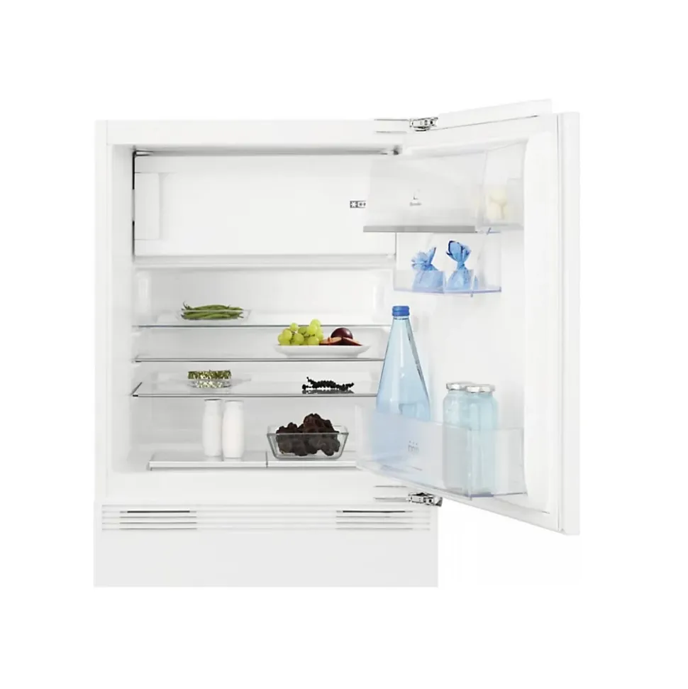 Réfrigérateur intégré Electrolux LFB3AE82R, 1 porte, 111L capacité totale, froid statique, éclairage LED, contrôle électronique, design compact blanc pour installation sous plan de travail.
