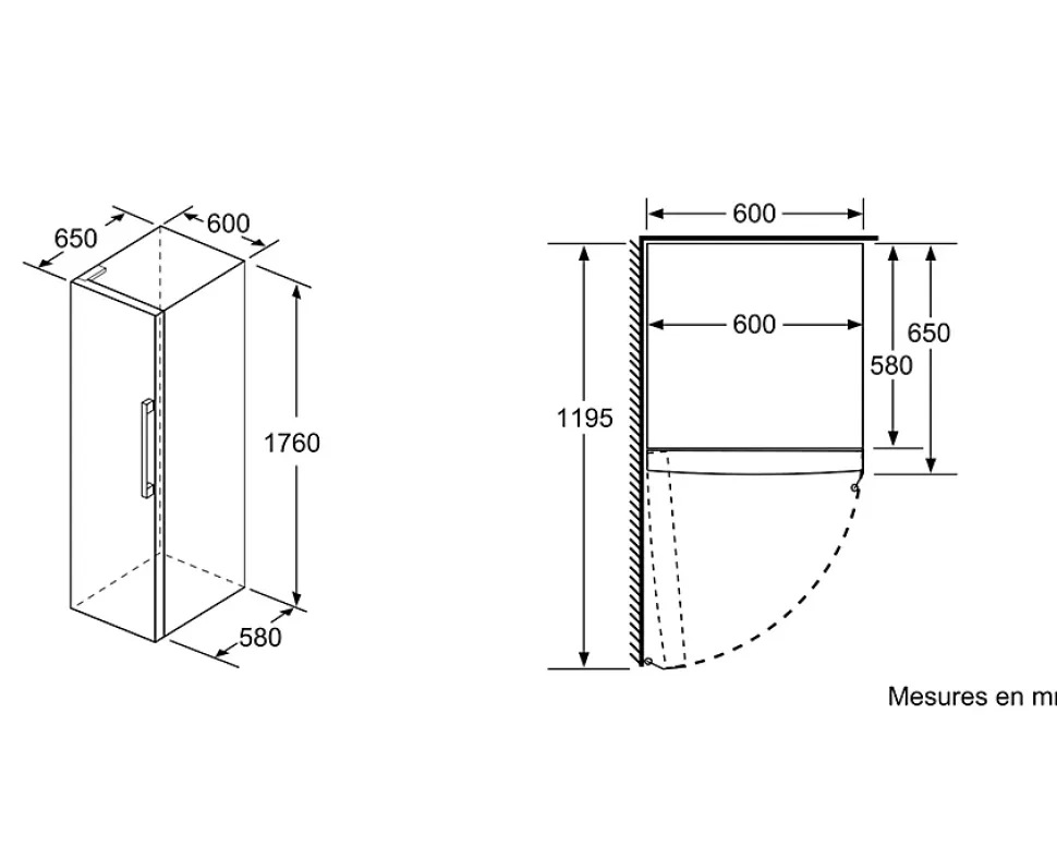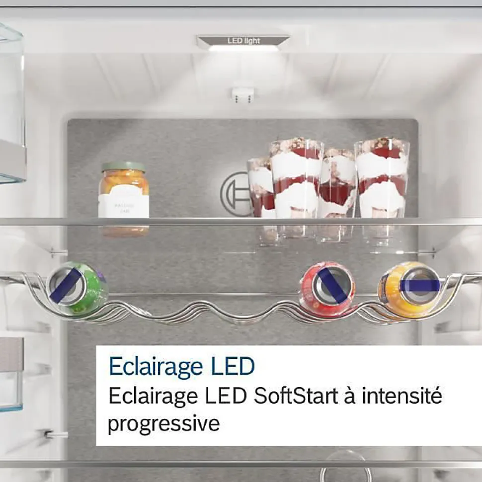 Réfrigérateur 1 porte 60cm 324l Bosch – Réfrigérateur monoporte Série 4 Bosch KSV33VLEP.Eclairage LED SoftStart à intensité progressive :Les lampes LED à intensité progressive, positionnées à l’avant du plafond ou intégrées dans les parois latérales, assurent un éclairage parfait de l’ensemble du compartiment. Peu consommatrices d’énergie, elles durent très longtemps et ne chauffent pas.Clayettes EasyAccess : un stockage en toute simplicité et une visibilité parfaite.Les clayettes en verre incassable sans cadre sont particulièrement simples à utiliser, grâce à leur système coulissant. elles peuvent être extraites vers l’extérieur de 16 cm. Ainsi, elles vous donnent une parfaite visibilité de votre nourriture à tout moment et facilitent le chargement et le déchargement des aliments.Super réfrigération :Refroidit les nouveaux aliments plus rapidement, tout en protégeant les aliments déjà à l’intérieur du réfrigérateur.FreshSense : conservation idéale des aliments :Grâce à des capteurs externes et internes au réfrigérateur, la température reste constante dans l’appareil malgré les variations de température. Ce système garantit des conditions de conservation idéales pour les aliments et un fonctionnement optimisé.Technologie Intelligent Inverter : une interaction efficace.La technologie « Intelligent Inverter » consiste en l’interaction intelligente des capteurs de température, du système électronique et du compresseur. Les capteurs contrôlent en permanence la température à l’intérieur et à l’extérieur du réfrigérateur. Les variations sont ensuite immédiatement transmises au système électronique afin que le compresseur adapte sa puissance à la situation. – Type de produit : Réfrigérateur.Volume total : 324 l.Classe d’efficacité énergétique Classe énergie : E.Consommation énergétique : 113 kWh/an.Niveau sonore : 39 DB.Classe d’efficacité sonore : Classe sonore_Eu19: C.Réfrigération dynamique par ventilateur.Rack à bouteilles