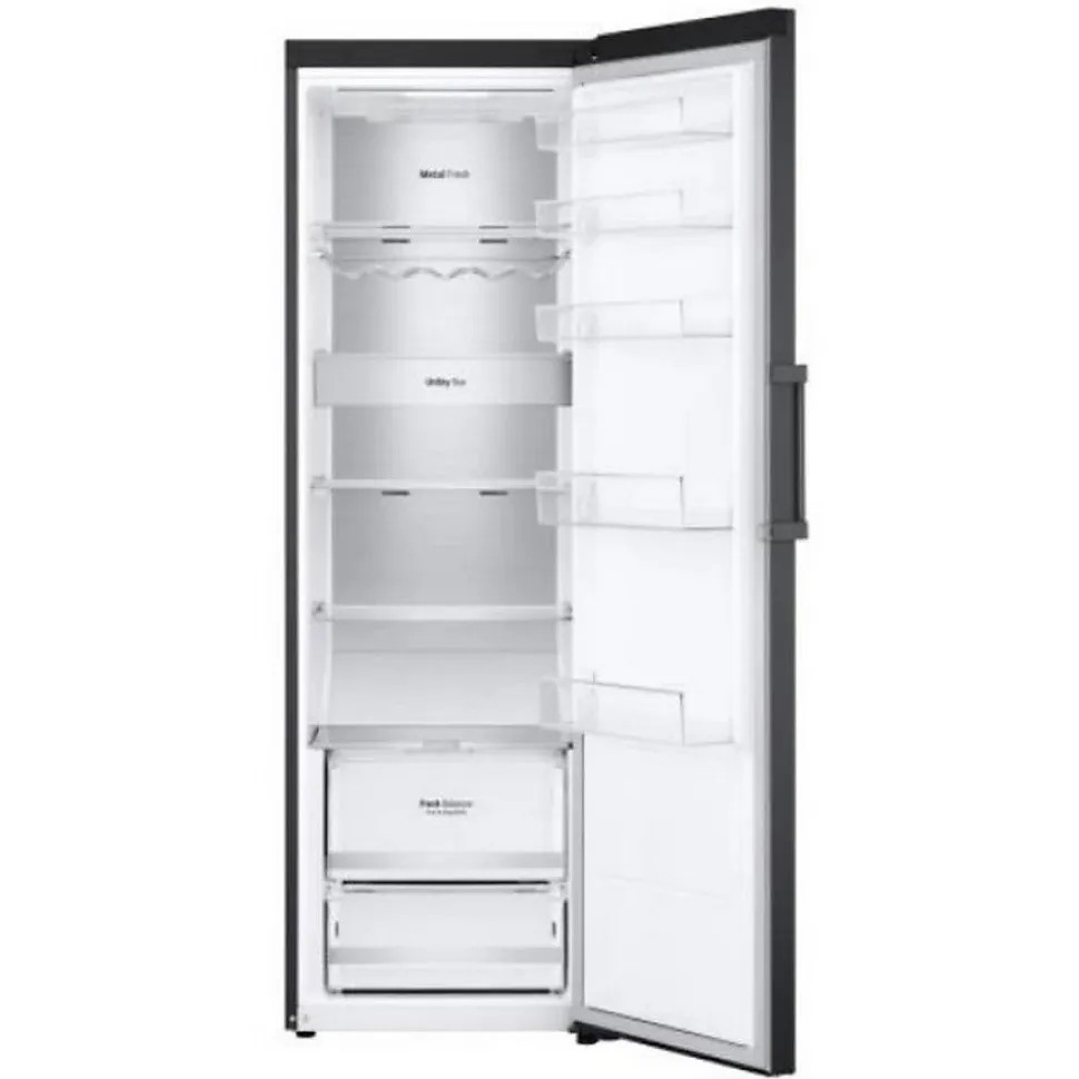Réfrigérateur 1 porte 60cm 386l nofrost noir Lg – Réfrigérateur 1 porte Door Cooling LG GLM71MCCSD ultra silencieux pour des espaces plus conviviaux. Door Cooling™ : Refroidit rapidement et uniformément de l’avant à l’arrière du réfrigérateur grâce à l’action du rideau d’air froid. Linear Cooling™ : En réduisant les fluctuations de température, les aliments conservent leur fraîcheur optimale plus longtemps. Fresh Balancer™ : Retient l’humidité en toute sécurité, tandis que les contrôleurs maintiennent l’humidité de façon optimale pour les fruits et les légumes, en fonction du mode que vous avez défini. Metal Touch Display™ : Écran tactile avec affichage transparent apportant une touche de premium à votre cuisine. – Type de produit : Réfrigérateur 1 porte.Modèles : Simple porte.Type de pose : Pose libre.Volume utile total (en litres) : 386.Capacité congélateur (en L) : 0.Capacité réfrigérateur (en L) : 386.Type de froid réfrigérateur : No Frost.Type de froid congélateur : Sans congélateur.Dégivrage du réfrigérateur : Dégivrage automatique.Dégivrage du congélateur : Sans congélateur.Technologie de froid (dénomination commerciale) : Door Cooling.Classe énergétique (2021) : D.Consommation énergie annuel (kWh/an) (2021) : 97.Classe climatique : T.Pouvoir de congélation (kg/24h) : Sans.Perception sonore (en dB) (2021) : 37.Classe de perception sonore (2021) : C.Type de Clayette : Verre.Nombre de clayettes : 5.Clayette porte bouteille : Oui.Eclairage LED : Oui.Moteur : Linéaire Inverter.Distributeur d’eau fraîche : Non.Raccordement alimentation d’eau : Pas d’arrivée d’eau.Bac avec régulateur d’humidité : Oui.Portes réversibles : Oui.Couleur (dénomination commerciale) : Carbone.Gamme : Door Cooling.Réfrigérateur connecté : Non.Dimensions du produit (H x L x P en cm) : 186 x 59.5 x 70.7.Famille de Couleur : Noir.Poids