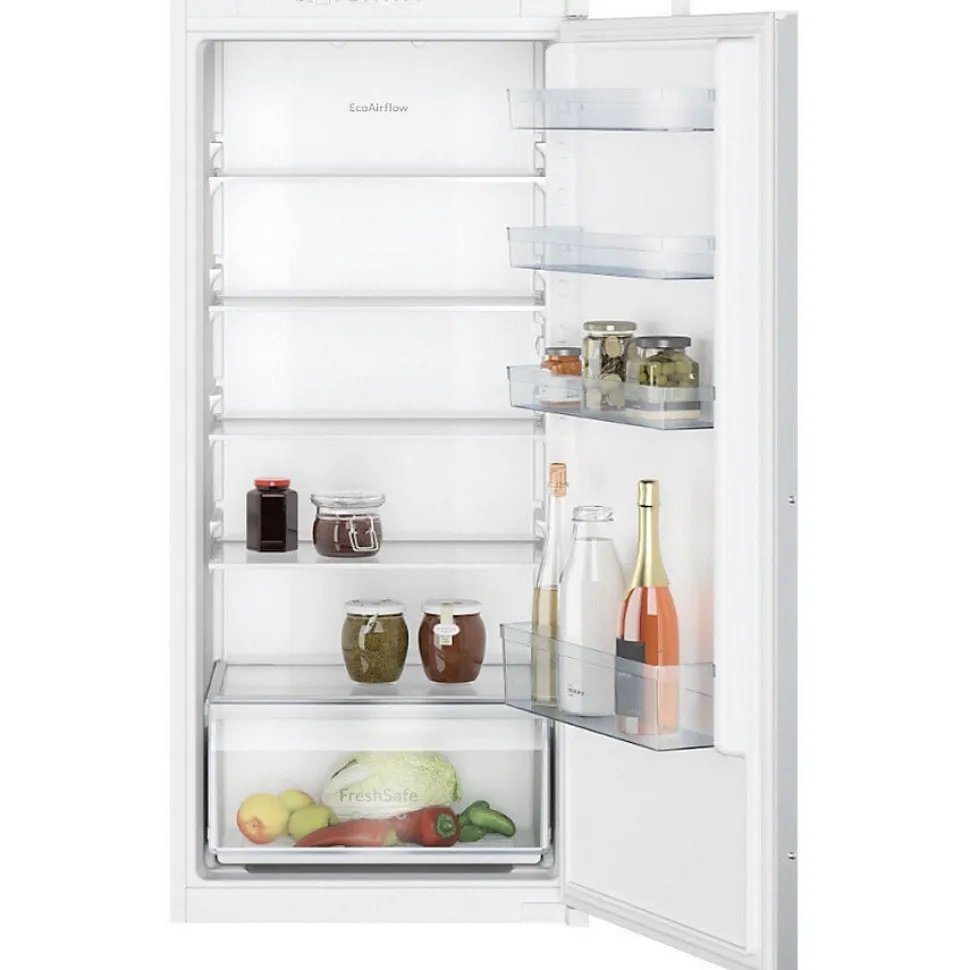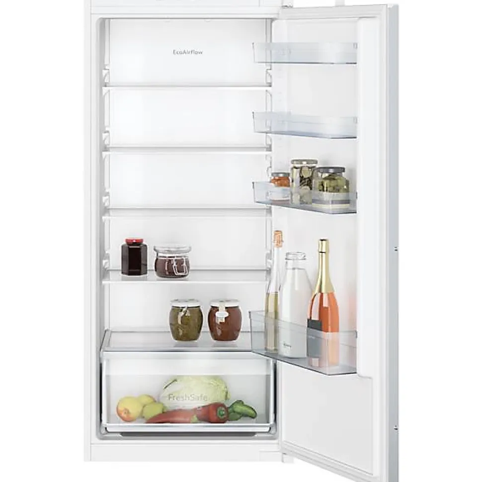 Réfrigérateur 1 porte intégrable à glissière 204l Neff – Réfrigérateur 1 porte intégrable Tout utile N30 Neff KI1411SE0 Doté d’une lumière LED éclatante et d’AutoAirflow pour des conditions optimales de conservation des aliments. Fonction Super réfrigératon avec arrêt automatique. EcoAirflow : une ventilation optimale et une température constante dans toute la zone froide. Commandes électroniques sur le top avec indicateur LED. FreshSense : les capteurs internes et externes garantissent une température constante dans l’appareil malgré les variations de température. – Type de produit : Réfrigérateur 1 porte intégrable.Volume (total) : 204 L.Volume (réf.) : 204 L.Type de froid : statique.Nombre de compresseurs : 1.Nombre de circuits : 1.Régulation : électronique.Affichage T° : oui.Niveau sonore : 35 dB.Conso élec. : 101 kWh / an.Classe climatique : SN-ST.Label énergie : E.Catégorie sonore : B.Dégivrage automatique.5 clayettes verre dont 4 réglables en hauteur.Tiroir à légumes FreshSafe.Eclairage LED.Alarme porte ouverte.Livré avec casiers à oeufs.Type de fixation : à glissières.Hauteur de niche : 122,5 cm.Dimensions Hors tout (LxHxP) : 54,1 x 122,1 x 54,8 cm.Dimensions Niche (LxHxP) : 56 x 122,5 x 55 cm.Porte(s) réversible(s) : oui.Poids net : 42,7 Kg.