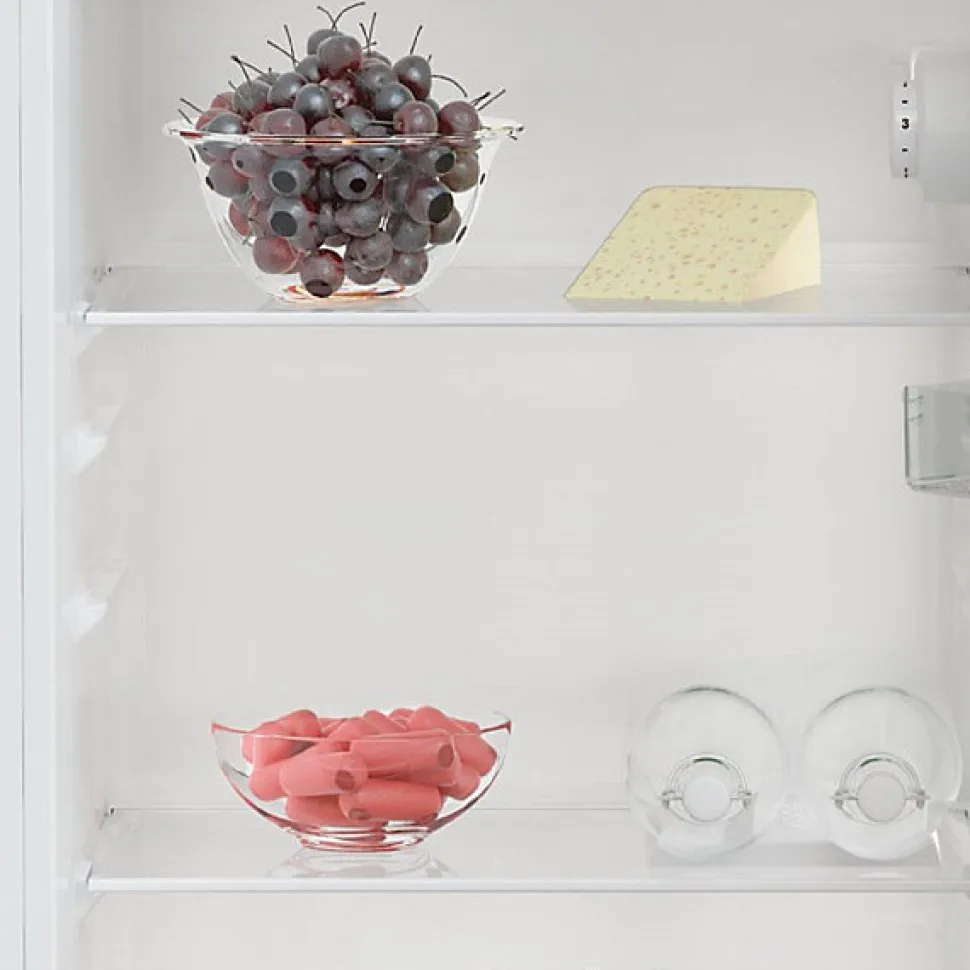 Réfrigérateur encastrable INDESIT SINS2211B4 1 porte 175 L (156 L réfrigérateur) – compact et silencieux (35 dB), classe énergétique E, dégivrage automatique du réfrigérateur, éclairage LED, porte réversible et glissières pour intégration facile. Inclus 4 clayettes en verre, 1 bac à légumes et 3 balconnets.