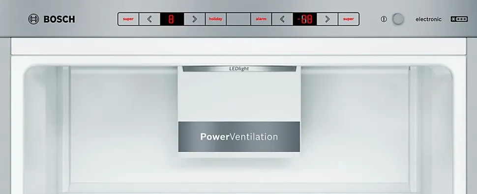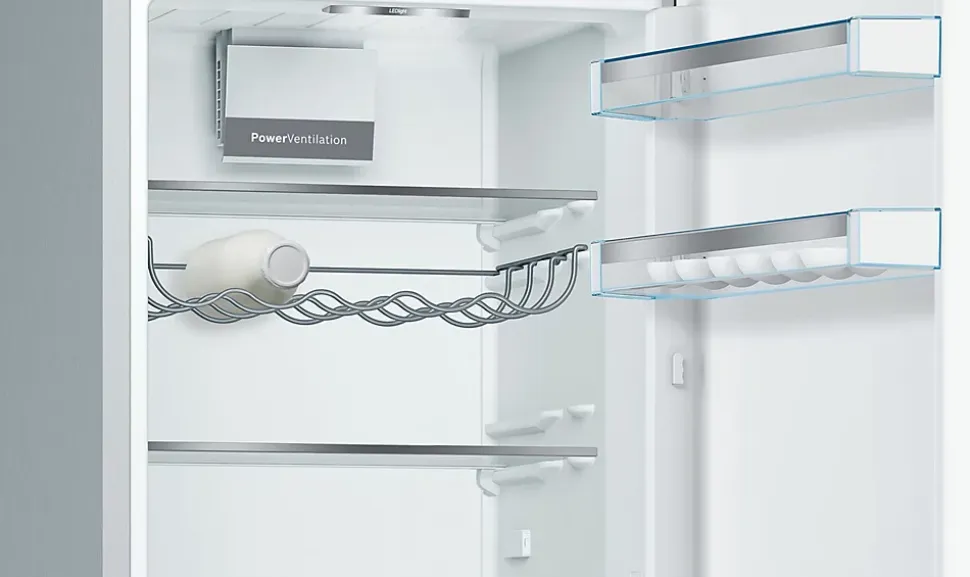 Réfrigérateur combiné 60cm 308l metal look Bosch – Le réfrigérateur combiné série 6 de Bosch KGE36ALCA avec VitaFresh 0°C : particulièrement efficace conserve votre viande et poisson frais jusqu’à deux fois plus longtemps.VitaFresh : conserve le croquant des aliments frais plus longtemps : grâce à des températures très basses pour la viande et le poisson et un taux d’humidité ajustable pour les fruits et légumes.Éclairage LED : pour une visibilité parfaite sur vos produits frais.BigBox : compartiment pour les grands produits surgelésClayette EasyAccess : grâce à cette clayette coulissante en verre, le contenu de votre réfrigérateur est beaucoup plus accessible.Low Frost : décongeler moins souvent grâce à la faible quantité de formation de glace pour un gain de temps et des économies en énergie. – Type de produit : Réfrigérateur.Gamme : Série 6.Type d’installation : Pose-libre.Classe d’efficacité énergétique : C.Consommation énergétique annuelle moyenne : 149 kWh / an.Volume total: 308 l.Volume utile partie congélation : 94 l.Volume utile partie réfrigération : 214 l.Volume net zone proche de 0°C: 22 litres.Niveau sonore : 38 dB(A) re 1pW.Classe de niveau sonore : C.Porte habillable : Pas possible.Puissance de raccordement : 90 W.Charnière de la porte : Droite réversible.Longueur du cordon électrique : 240.0 cm.Nombre de compresseurs : 1.Nombre de circuit de froid : 2.Y a-t-il un ventilateur dans le compartiment réfrigérateur : Oui.Porte réversible : Oui.Nombre de clayettes dans le réfrigérateur : 2.Clayettes spéciales bouteille : Oui.Froid ventilé : Non.Bottom-Freezer.LowFrost dégivrage rapide et moins fréquent.Portes InoxLook, parois Pearl Grey.Poignée verticale intégrée.Réglage électronique de la température, affichage précis.Système d’alarme optique et acoustique en cas d’augmentation de la