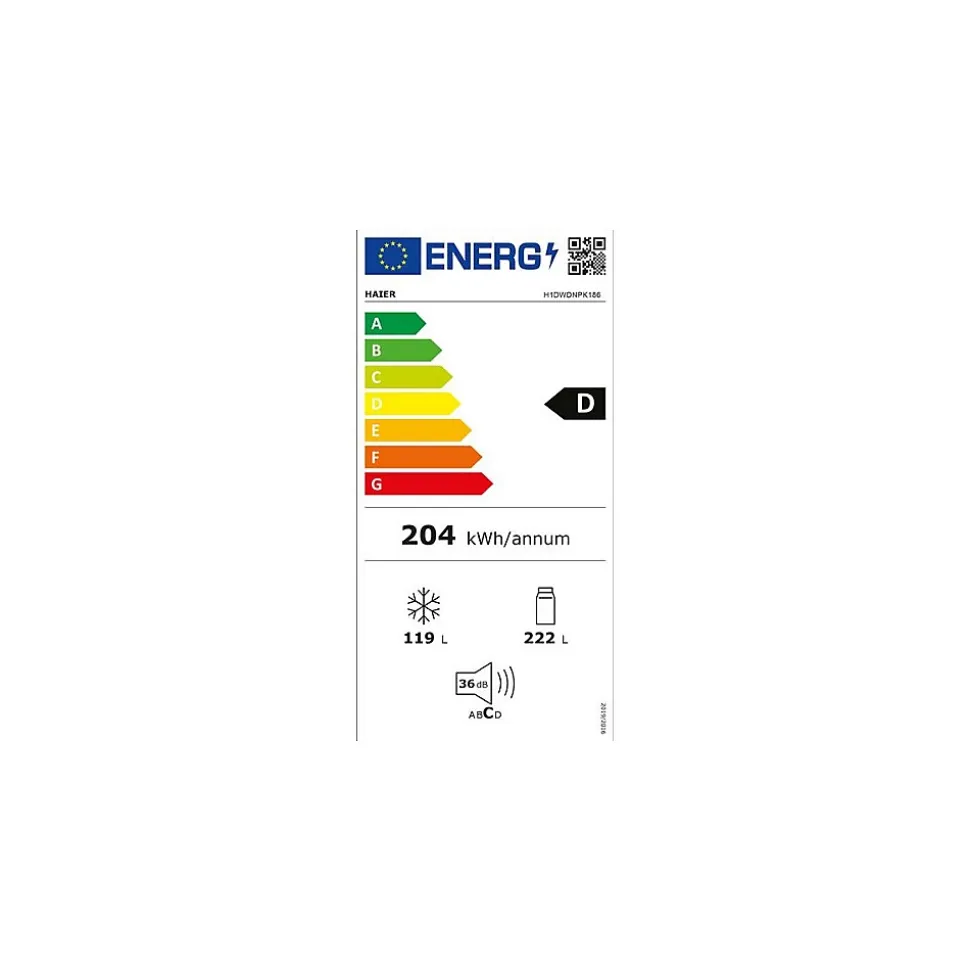 Réfrigérateur combiné Total No-Frost – Réfrigérateur No-Frost : 222 L – Avec la technologie Total No-Frost Air Surround, l’air circule dans le réfrigérateur de façon homogène. Ce système permet de préserver la fraicheur et le goût des aliments – Fonction Super Réfrigération – Clayettes verre – Eclairage LED – Le bac à légumes Humidity Zone garantit un taux d’humidité de 90% tout en laissant circuler l’air. Vous préservez ainsi à la perfection les qualités nutritionnelles de vos fruits et légumes. Cette technologie assure une conservation optimale – Congélateur No-Frost : 119 L – 3 tiroirs – Fonction Congélation rapide – Commande électronique interne – Fonction Vacances – Connecté WiFi : la connectivité fonctionne avec l’application hOn vous offrant une expérience d’usage inédite, comprenant vos besoins et les anticipant. Votre réfrigérateur s’adapte à vos besoins pour une meilleure préservation de vos aliments visuelles et sonores – Poignées intégrées – Finition Effet inox.Référence fournisseur H1DWDNPK186Code EAN 8059019057071Nomenclature douanière 84182199Largeur 59,5 cmHauteur 185 cmVolume (total) 341 LVolume (réf.) 222 LVolume (cong.) 119 LType de froid Total No-FrostNombre de compresseurs 1Nombre de circuits 2Régulation électroniqueAffichage T° nonDistributeur d’eau sansPouvoir de congélation 8 Kg/24HAutonomie 10 heuresClasse climatique N-STConnecté ouiLabels et points clésLabel énergie DConso élec. 204 kWh / anCatégorie sonore CNiveau sonore 37 dBLe + produit Sa connectivité fonctionne avec l’application hOn vous offrant une expérience d’usage inédite !Dimensions (LxHxP) 59,5 x 185 x 65,8 cmPoids net 69,5 KgColoris silverPorte(s) réversible(s) ouiLieu de fabrication Roumanie