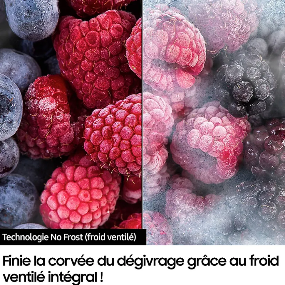 Réfrigérateur combiné 60cm 344l nofrost, blanc Samsung – Réfrigérateur combiné NoFrost Samsung RB33B610EWW. La technologie MultiFlow permet une fraîcheur homogène à tous les étages de votre réfrigérateur. Elle ajuste constamment la température et injecte de l’air frais par des évents placés stratégiquement. Ainsi, tous les produits sur tous les étages restent bien frais. Compresseur Inverter : silence, fiabilité et économies. La technologie d’isolation SpaceMax permet d’avoir des parois plus fines et donc de gagner en capacité intérieure tout en offrant une meilleure efficacité énergétique. – Type de produit : Réfrigérateur combiné.Volume (total) : 344 L.Volume (réf.) : 230 L.Volume (cong.) : 114 L.Type de froid : Total No-Frost.Nombre de compresseurs : 1.Nombre de circuits : 1.Régulation : mécanique.Affichage T° : oui.Distributeur d’eau : sans.Pouvoir de congélation : 7 Kg/24H.Autonomie : 9 heures.Classe climatique : SN-T.Connecté : non.Label énergie : E.Conso élec. : 254 kWh / an.Catégorie sonore : B.Niveau sonore : 35 dB.Le + produit : Total No-Frost MultiFlow.Réfrigérateur No-Frost.Clayettes verre.Bac à légumes.Balconnet XL.Eclairage LED.Congélateur No-Frost.3 tiroirs.Commande mécanique par molette.Alarme sonore Porte ouverte.Poignées intégrées.Porte(s) réversible(s) : oui.Finition blanc.Coloris : blanc.Dimensions (LxHxP) : 59,5 x 185,3 x 65,8 cm.Poids net : 66 Kg.