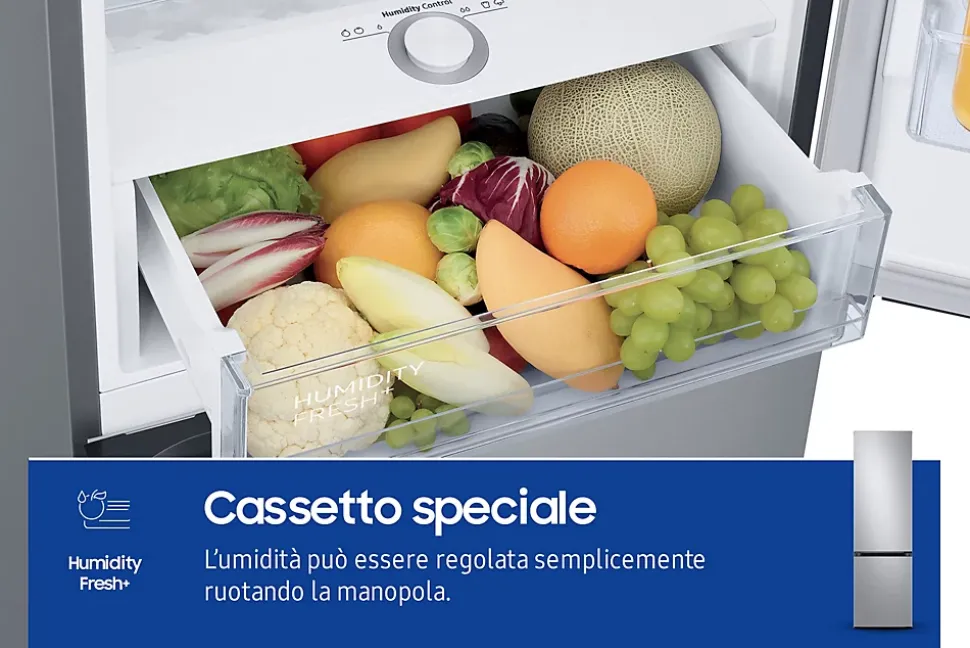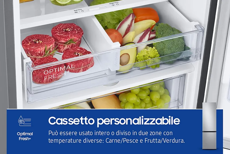 Réfrigérateur combiné 60cm 390l nofrost, gris Samsung – Réfrigérateur combiné NoFrost Samsung RB38C603DSA pour stocker plus, plus longtemps. La technologie MultiFlow permet une fraîcheur homogène à tous les étages de votre réfrigérateur. Elle ajuste constamment la température et injecte de l’air frais par des évents placés stratégiquement. Ainsi, tous les produits sur tous les étages restent bien frais. Compresseur Inverter : silence, fiabilité et économies. La technologie d’isolation SpaceMax permet d’avoir des parois plus fines et donc de gagner en capacité intérieure tout en offrant une meilleure efficacité énergétique. – Type de produit : Réfrigérateur combiné.Volume (total) : 390 L.Volume (réf.) : 276 L.Volume (cong.) : 114 L.Type de froid : Total No-Frost.Nombre de compresseurs : 1.Nombre de circuits : 1.Régulation : électronique.Affichage T° : oui.Distributeur d’eau : sans.Pouvoir de congélation : 8 Kg/24H.Autonomie : 9 heures.Classe climatique : SN-T.Connecté : non.Label énergie : D.Conso élec. : 211 kWh / an.Catégorie sonore : B.Niveau sonore : 35 dB.Le + produit : Tiroirs Optimla Fresh+ et Humidity Fresh+.Réfrigérateur No-Frost.Fonction Réfrigération rapide.Clayettes verre.2 tiroirs dont un Optimla Fresh+ et un Humidity Fresh+.Eclairage LED.Congélateur No-Frost.3 tiroirs.Fonction Congélation rapide.Commandes électroniques internes.Alarme sonore Porte ouverte.Connectivité WiFi SmartThings.Poignées intégrées.Porte(s) réversible(s) : oui.Finition Metal Grey.Dimensions (LxHxP) : 59,5 x 203 x 65,8 cm.Coloris : silver.Poids net : 71 Kg.