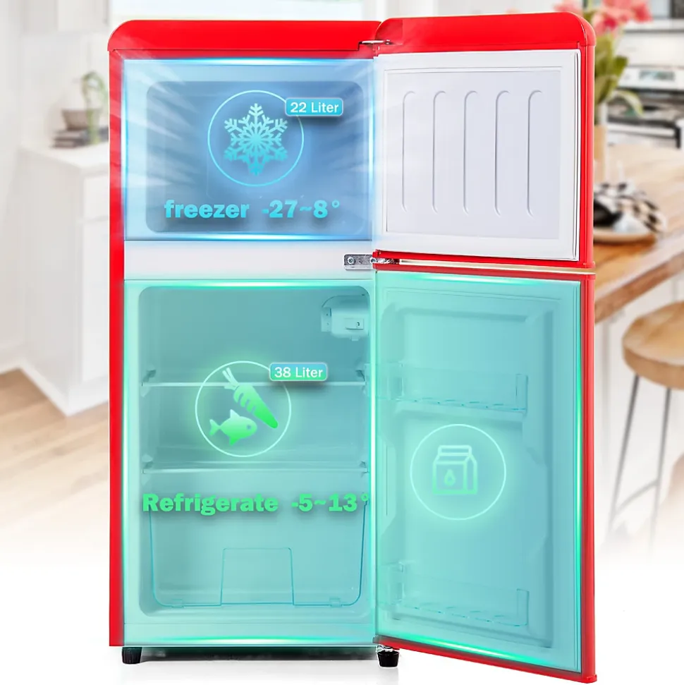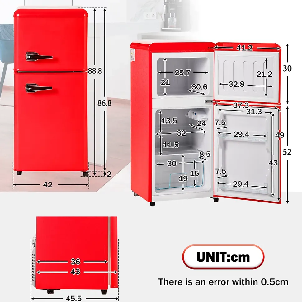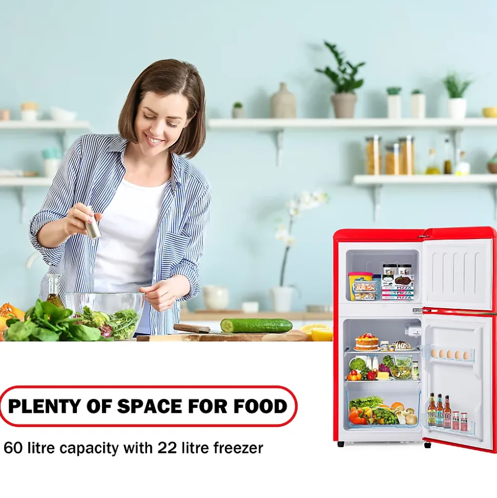 1. Design compact à deux portes : Ce réfrigérateur rouge à double porte arbore un style rétro moderne et compact, parfait pour les espaces comme le salon, la cuisine ou à côté du canapé. Il est idéal en tant que réfrigérateur d’appoint pour conserver boissons et snacks à portée de main. Avec une capacité de 60 litres et un éclairage LED anti-éblouissement, il combine esthétique et fonctionnalité.2. Haute efficacité énergétique : Ce réfrigérateur rouge est classé en classe énergétique E selon les dernières normes européennes. Il est équipé d’un congélateur 4 étoiles et consomme seulement 102 kWh par an avec un niveau sonore de 45 dB. Le réfrigérant R600a et le compresseur puissant assurent un refroidissement performant, avec une plage de température allant de -27°C à 13°C.3. Agencement intérieur flexible : Le compartiment de réfrigération offre 38 litres de capacité et comprend une clayette pour les œufs et un espace dédié aux bouteilles dans la porte. Les deux étagères internes sont ajustables pour s’adapter aux différents besoins de stockage, optimisant ainsi l’organisation.4. Compartiments séparés : Ce réfrigérateur dispose d’un compartiment congélateur distinct du compartiment de réfrigération, évitant tout mélange d’odeurs entre les aliments. Cette conception favorise une meilleure conservation, une hygiène accrue et une utilisation plus pratique pour l’organisation et le nettoyage.spécification:Dimensions du produit : 88,8 x 45,5 x 42,5 cmConsommation annuelle d’énergie : 102 kWh/anBruit : 45 dBCapacité totale : 60 LCompartiment congélateur : 22LCompartiment réfrigéré : 38LClasse d’efficacité énergétique : EPoids net : 17 kgPoids brut : 19 kg⚠️ ⚠️ Attention :1.Afin de limiter les retours et de réduire le gaspillage des ressources, nous vous invitons à vérifier avant l’achat que l’espace prévu pour l’installation du réfrigérateur est adapté.2.Les images sont présentées à titre indicatif. Veuillez vous référer aux dimensions réelles du produit.