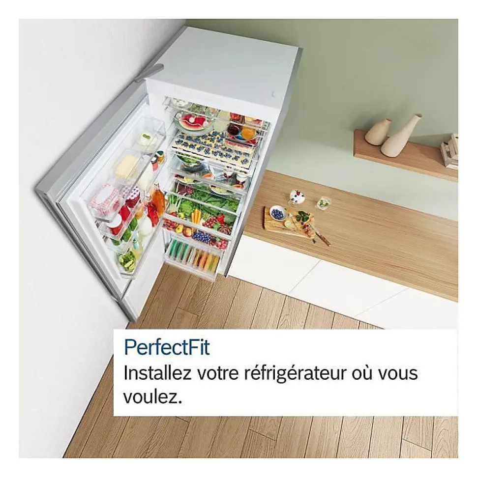 Réfrigérateur combiné 70cm 440l nofrost Bosch – Réfrigérateur combiné Série 6 Bosch KGN49AIBT. Le combiné No Frost avec VitaFresh et une capacité XXL : Conserve plus longtemps la fraîcheur de vos aliments frais. VitaFresh XXL : des tiroirs extra-larges offrant les conditions idéales pour conserver vos aliments plus longtemps. NoFrost : le dégivrage du réfrigérateur et du congélateur, c’est terminé. Paroi arrière en métal avec Multi Airflow : fait circuler uniformément de l’air frais pour maintenir des températures constantes. Eclairage LED : éclairage uniforme de votre réfrigérateur, sans éblouissement. Perfect Fit : installer votre réfrigérateur directement collé à un mur ou un autre appareil n’est plus un problème. – Type de produit : Réfrigérateur combiné.Type de pose : Pose libre.Volume utile total (en litres) : 440.Capacité congélateur (en L) : 129.Capacité réfrigérateur (en L) : 311.Type de froid réfrigérateur : Ventilé.Type de froid congélateur : No Frost.Dégivrage du réfrigérateur : Dégivrage automatique.Dégivrage du congélateur : Dégivrage automatique.Technologie de froid (dénomination commerciale) : No frost.Classe énergétique (2021) : B.Consommation énergie annuel (kWh/an) (2021) : 142.Classe climatique : SN-T.Autonomie en cas de coupure (en h) : 21.Pouvoir de congélation (kg/24h) : 11.5.Perception sonore (en dB) (2021) : 35.Classe de perception sonore (2021) : B.Type de Clayette : Verre de sécurité.Nombre de clayettes : 5.Clayette porte bouteille : Oui.Eclairage LED : Oui.Nombre de circuits : 2.Distributeur d’eau fraîche : Non.Fabrique de glaçons : Non, bac à glaçons manuel.Bac avec régulateur d’humidité : Oui.Portes réversibles : Oui.Famille de Couleur : Inox.Gamme : Série 6.Réfrigérateur connecté : Non.Dimensions du produit (H x L x P en cm) : 203 / 70 / 66.7.Poids net (en Kg) : 110.7.