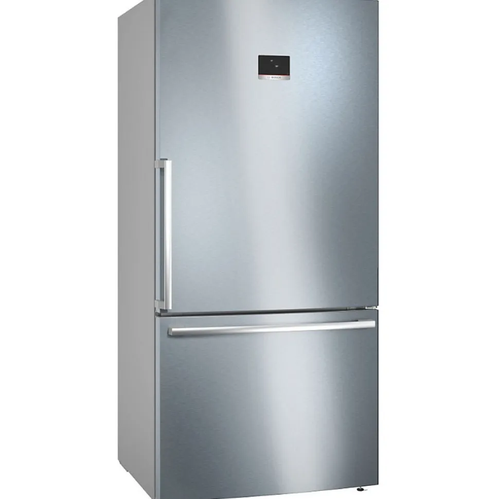 Réfrigérateur combiné 86cm 631l nofrost Bosch – Réfrigérateur combiné Série 4 Bosch KGB86XIEP avec système MultiAirFlow pour une circulation de l’air optimale et une température uniforme à tous les niveaux. Fonction Super réfrigération avec arrêt automatique. 2 compartiments VitaFresh Plus pour fruits et légumes avec contrôle d’humidité. 2 compartiments VitaFresh Plus 0°C : les viandes et poissons restent frais jusqu’à deux fois plus longtemps. Commandes sensitives TouchControl en façade avec affichage LCD. Chaque zone de température contrôlable et réglable séparément. (Pour atteindre la consommation d’énergie annoncée, les butées de ventilations jointes doivent être utilisées. En conséquence, la profondeur de l’appareil s’accroît d’environ 3,5 cm. L’appareil utilisé sans ces butées est parfaitement fonctionnel, mais a une consommation sensiblement plus élevée.) – Type de produit : Réfrigérateur combiné.Volume (total) : 631 L.Volume (réf.) : 479 L.Volume (cong.) : 152 L.Type de froid : Total No-Frost.Nombre de compresseurs : 1.Nombre de circuits : 2.Régulation : électronique.Affichage T° : oui.Distributeur d’eau : sans.Pouvoir de congélation : 10 Kg/24H.Autonomie : 17 heures.Classe climatique : SN-T.Connecté : non.Label énergie : E.Conso élec. : 307 kWh / an.Catégorie sonore : C.Niveau sonore : 40 dB.Le + produit : 2 trioirs VitaFresh XXL avec humidité contrôlée.3 clayettes verre.Eclairage LED SoftStart à intensité progressive.Congélateur 2 tiroirs.Alarmes visuelle et sonore.Portes inox anti-trace.Porte(s) réversible(s) : oui.Dimensions (LxHxP) : 86 x 186 x 81 cm.Coloris : inox.Poids net : 117,4 Kg.