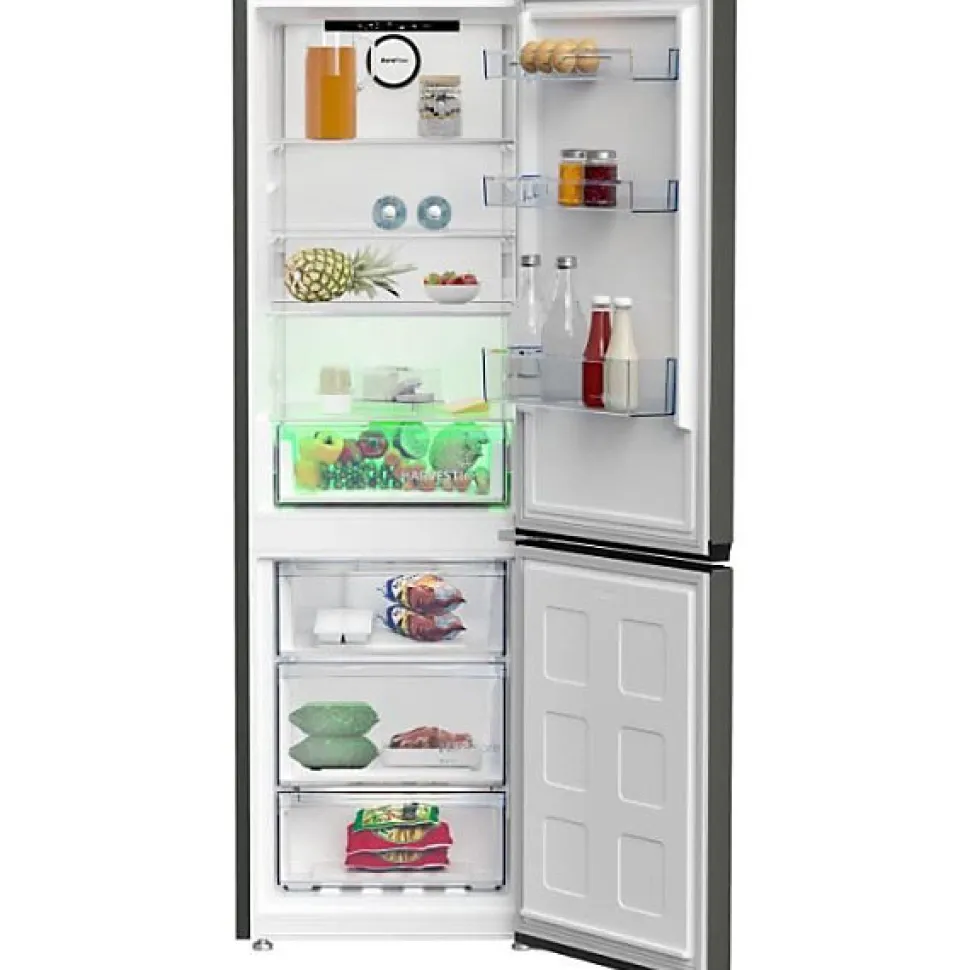 Beko B5RCNE366HG 316 L (210+106) Manhattan Gray : combiné No Frost avec AeroFlow et HarvestFresh pour une conservation optimale, congélation rapide, porte réversible, écran intégré et faible niveau sonore (35 dB).