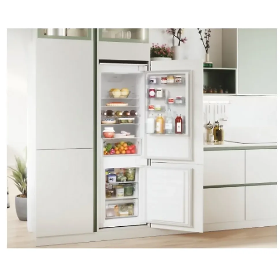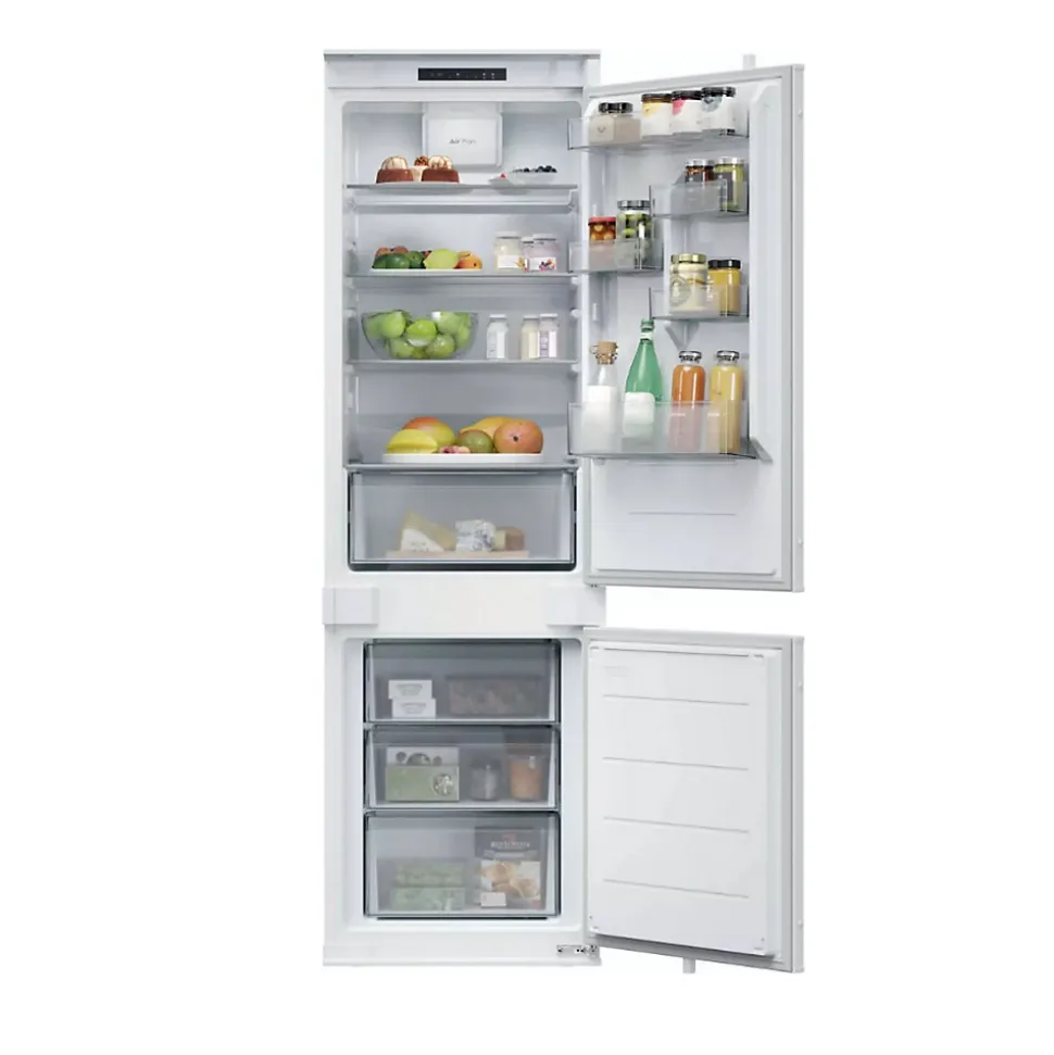 Alarme porte ouverte : OuiAutonomie (h) : 13Autre(s) équipement(s) : Bac à glaçonsCapacité : De 200 à 350 LClasse climatique : SN-ST. Cet appareil est conçu pour être utilisé à une température ambiante comprise entre 10°C et 38°CClasse d’efficacité énergétique : EClasse d’efficacité énergétique de la source lumineuse : GClasse d’émission de bruit acoustique dans l’air : BClasse énergétique : ECongélation rapide ou Super Congélation : OuiConso. d’énergie annuelle (kWh/an) : 220Couleur : IntégrableDégivrage congélateur : ManuelDimensions H x L x P (cm) : 177.2 x 54 x 55Dispositif de congélation rapide : NonDistributeur d’eau : NonEmissions de bruit acoustique dans l’air (dB(A)) : 35Encastrement H x L x P (cm) : 177.8-178.2 x 56-56.8 x 56Hauteur (cm) : 177.2Hauteur encastrement (cm) : 177.8IEE : 100Largeur (cm) : 54Largeur encastrement (cm) : 56Mode de dégivrage congélateur : ManuelMode de dégivrage réfrigérateur : AutomatiqueNbre de balconnets contre-porte : 5Nbre de clayette(s) réglable(s) : 3Nbre de tiroir(s) : 3Nbre total de clayette(s) : 4Poids (kg) : 56Porte à habiller : OuiPorte d’habillage fournie : Non (nécessite la pose d’une porte assortie à la cuisine)Porte réversible : OuiPosition du congélateur : BasPouvoir de congélation spécifique (kg/24h) : 3Profondeur (cm) : 55Profondeur encastrement (cm) : 56Réfrigérateur connecté : NonRéfrigération rapide ou Super Réfrigération : OuiRéglage hiver : NonRégulation de la température : ElectroniqueSystème de porte : GlissièreTechnologie froid congélateur : Low FrostType : Réfrigérateur combiné intégréType d’éclairage : LEDType de clayette(s) : VerreType de compresseur : InverterType de construction : IntégrableType de dégivrage : AutomatiqueType de froid du congélateur : StatiqueType de froid du réfrigérateur : BrasséType de poignée(s) : IntégréesType de source lumineuse : LEDType réfrigérateur : Réfrigérateur – Congélateur en basT°C recommandée pour stockage optimisé des denrées alimentaires dans compartiment 4 étoiles