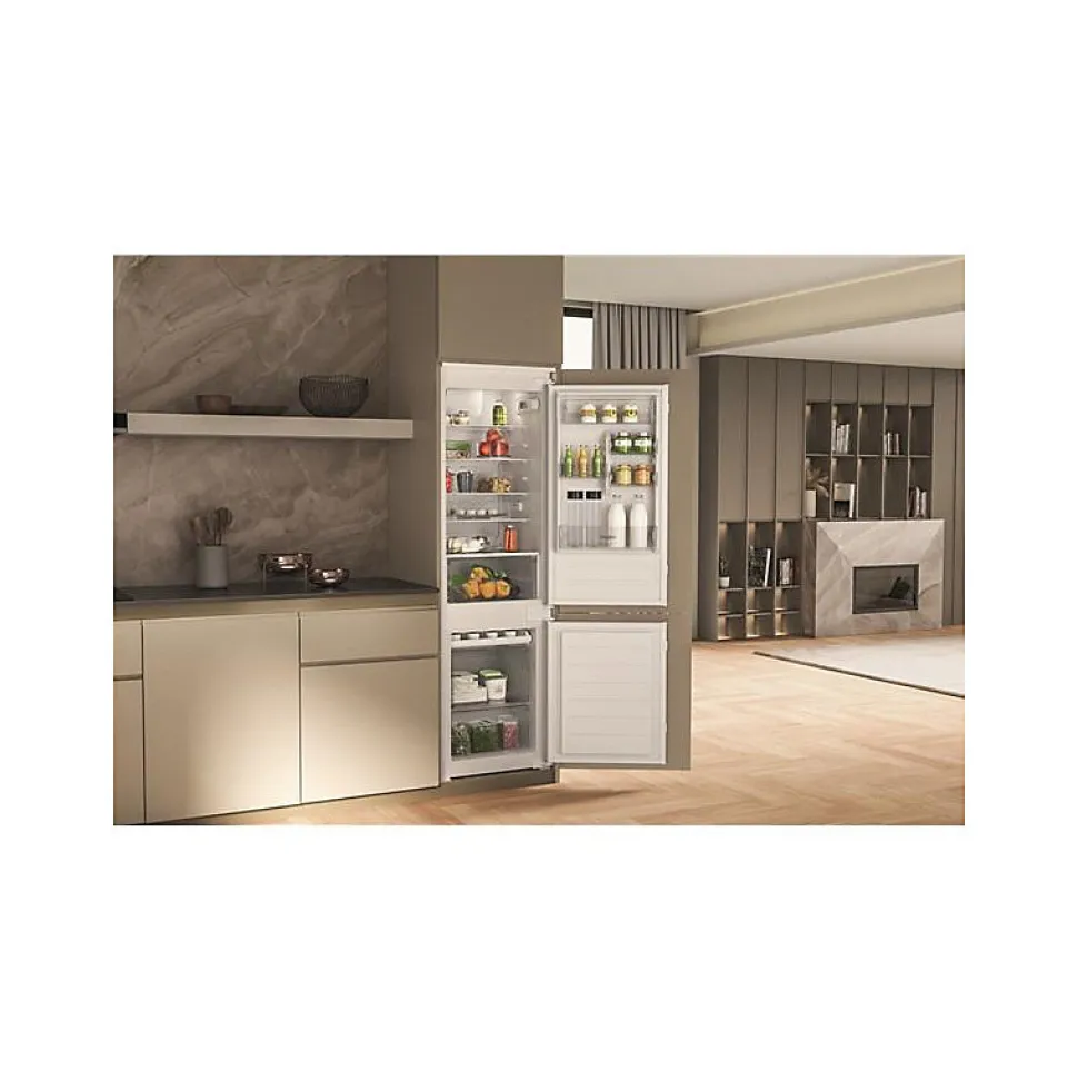 Alarme porte ouverte : OuiAutonomie (h) : 12Autre(s) équipement(s) : 2 plateauxCapacité : De 200 à 350 LClasse climatique : SN-T. Cet appareil est conçu pour être utilisé à une température ambiante comprise entre 10°C et 43°CClasse d’efficacité énergétique : EClasse d’efficacité énergétique de la source lumineuse : GClasse d’émission de bruit acoustique dans l’air : BClasse énergétique : EConso. d’énergie annuelle (kWh/an) : 227Conso. énerg. en 24h (kWh) : 0.62Couleur : IntégrableDégivrage congélateur : ManuelDimensions H x L x P (cm) : 177 x 54 x 54.5Dispositif de congélation rapide : OuiDistributeur d’eau : NonEmissions de bruit acoustique dans l’air (dB(A)) : 34Encastrement H x L x P (cm) : 177.6-178.6 x 56-57 x 56Hauteur (cm) : 177Hauteur encastrement (cm) : 177.6IEE : 100Largeur (cm) : 54Largeur encastrement (cm) : 56Mode de dégivrage congélateur : ManuelMode de dégivrage réfrigérateur : AutomatiqueNbre de balconnets contre-porte : 5Nbre de clayette(s) réglable(s) : 4Nbre de tiroir(s) : 3Nbre total de clayette(s) : 5Nombre d’étoiles : 4Poids (kg) : 50.6Porte à habiller : OuiPorte d’habillage fournie : Non (nécessite la pose d’une porte assortie à la cuisine)Porte réversible : OuiPosition du congélateur : BasPouvoir de congélation spécifique (kg/24h) : 4Profondeur (cm) : 54.5Profondeur encastrement (cm) : 56Réfrigérateur connecté : NonRéglage hiver : NonRégulation de la température : ElectroniqueSystème de porte : GlissièreTechnologie froid congélateur : StopFrostType : Réfrigérateur combiné intégréType d’éclairage : LEDType de clayette(s) : VerreType de construction : IntégrableType de dégivrage : AutomatiqueType de froid du congélateur : StatiqueType de froid du réfrigérateur : BrasséType de source lumineuse : LEDType réfrigérateur : Réfrigérateur – Congélateur en basT°C recommandée pour stockage optimisé des denrées alimentaires dans compartiment 4 étoiles (°C) : -18T°C recommandée pour stockage optimisé des denrées alimentaires fraîches (°C) : 4Volume (L) :