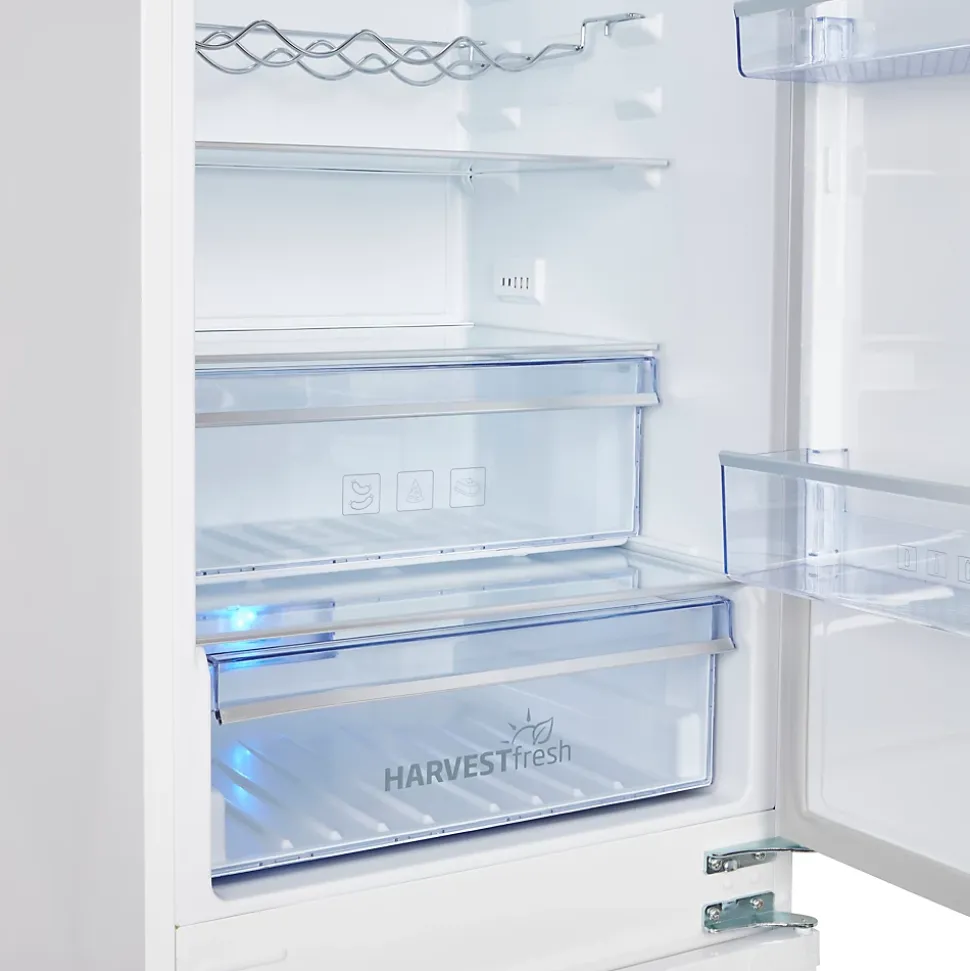 Ce réfrigérateur congélateur combiné 70/30 encastrable Beko est équipé d’une alarme de porte ouverte, d’un plateau à glace, d’un plafonnier avec LED et d’un casier à bouteilles. La technologie HarvestFresh™ dans le bac à légumes permet de préserver le goût et les vitamines des fruits et légumes.