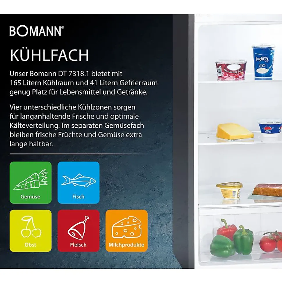 La solution idéale pour votre cuisine : découvrez un combiné blanc au design épuré offrant 206 litres de stockage parfaitement répartis. Compact et fonctionnel, il s’intègre avec simplicité dans tous les types d’intérieurs tout en assurant une conservation optimale.Spécifications- Capacité nette : 206 litres- Réfrigérateur : 165 litres- Congélateur : 41 litres- Contrôle progressif de la température- Arrêt de porte à droite, réversible- Pieds réglables- RoulettesRéfrigérateur- Lumière intérieure LED- Plage de température : 0°C ~ +8°C- Boîte à légumes transparente- 3 Étagères en verre, 2x réglables en hauteur- 3 supports de rangement pour portes- Plateau à oeufsCongélateur- Congélateur 4 étoiles- Plage de température : ≤ -18°C- Capacité de congélation : 2 kg / 24 h- Durée de conservation par coupure de courant : max. 12 h- Tablette en verre, amovible- Bac à glaçonsDonnées techniquesTension de raccordement : 220-240 V~ / 50 HzPuissance nominale : 75 WClasse climatique : N/ST (+16°C ~ +38°C)Liquide de refroidissement : R600aNiveau de bruit : 40 dBDonnées de consommationConsommation d’énergie / 24 h : 0,483 kWhConsommation d’énergie / année : 176 kWh(selon le règlement européen sur les fiches de données n° 2019/2016)