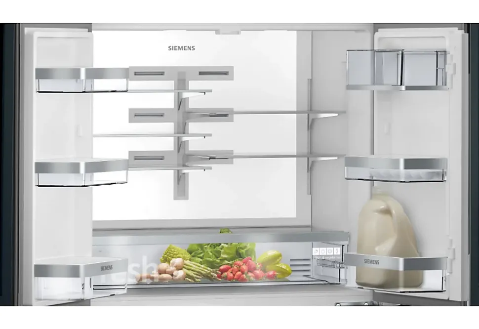 Présentation GénéraleLe réfrigérateur multi-portes Siemens KF96RSBEA est un modèle élégant et fonctionnel, conçu pour offrir une expérience de stockage et de conservation optimale. Avec sa capacité totale de 572 litres, il est idéal pour les familles ou les foyers qui nécessitent un espace de réfrigération généreux. Ce modèle se distingue par son design français avec une porte inférieure pour le congélateur, offrant ainsi un accès facile aux aliments.Conception et FonctionnalitésCe réfrigérateur est équipé de plusieurs fonctionnalités pratiques, notamment des étagères en verre brise-secousses faciles à nettoyer et un éclairage LED pour une visibilité optimale. Le système noFrost garantit une circulation d’air efficace, évitant ainsi la formation de glace et facilitant l’entretien. De plus, le bac à légumes avec humidité réglable permet de maintenir les fruits et légumes frais plus longtemps.Performances ÉnergétiquesLe réfrigérateur Siemens KF96RSBEA est équipé d’un compresseur Intelligent Inverter, qui ajuste automatiquement la vitesse pour maintenir une température optimale tout en réduisant le bruit et la consommation d’énergie. Ce système assure une efficacité stable et une performance énergétique optimale, même en cas de fluctuations de tension.Intégration et UtilisationConçu pour être installé en libre-stance, ce réfrigérateur nécessite une marge de sécurité avec les meubles et murs environnants pour assurer une évacuation de chaleur efficace. Il est classé dans la classe climatique SN-T, ce qui signifie qu’il est adapté à une large gamme de conditions climatiques.