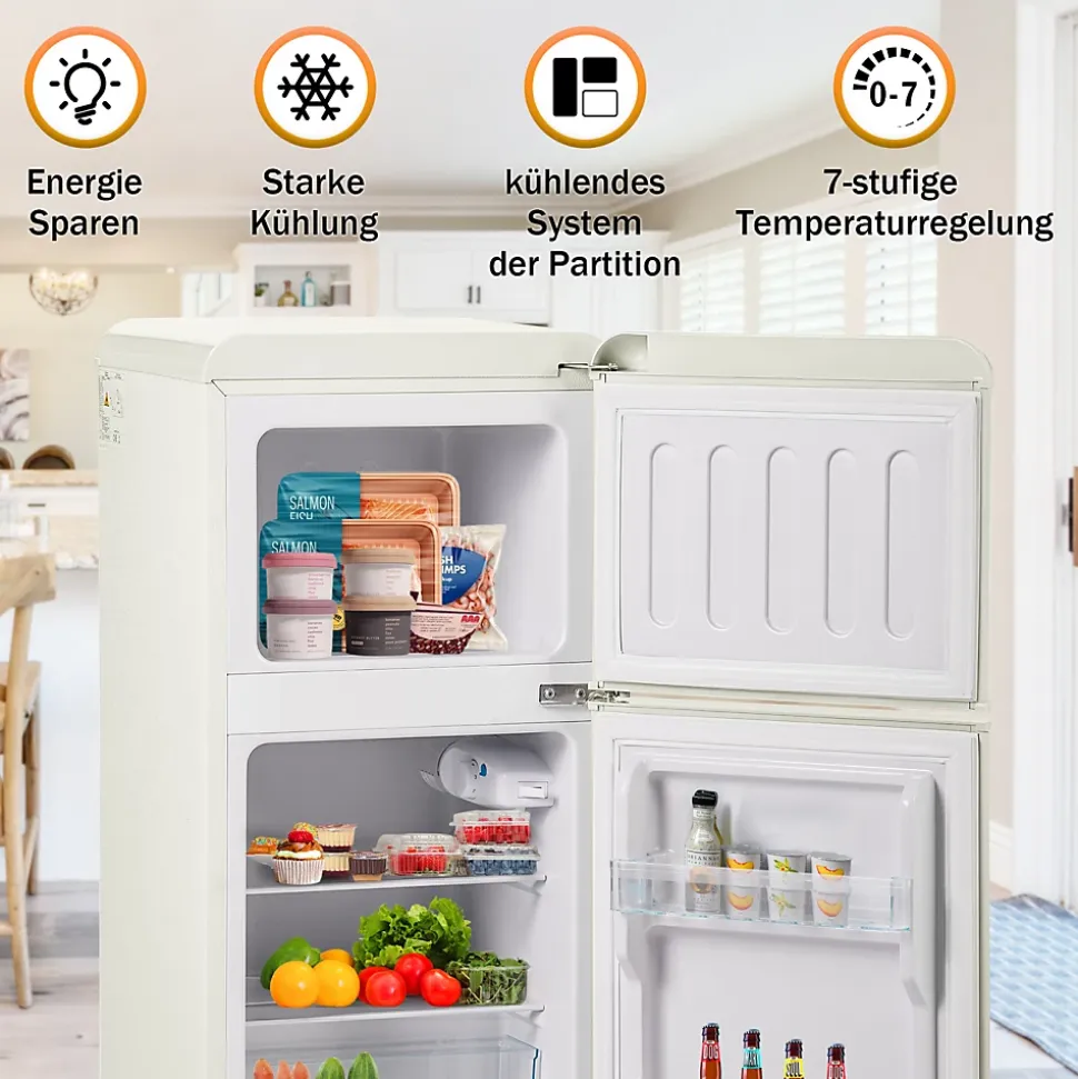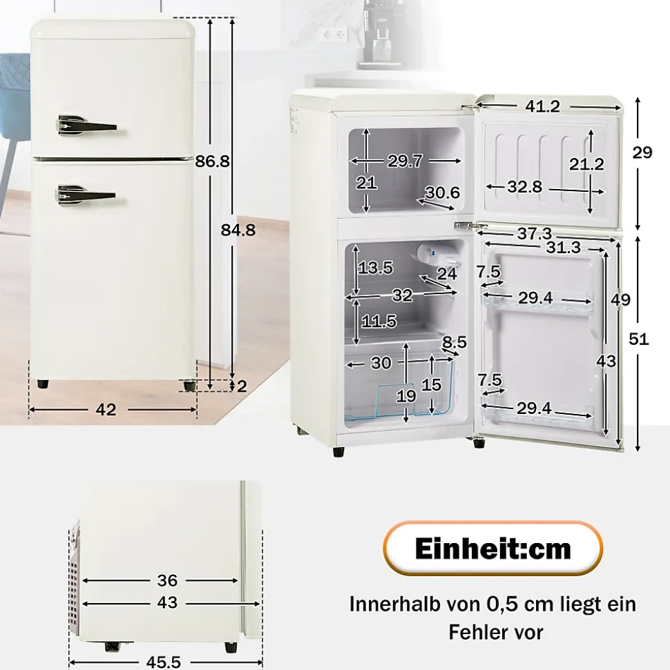 Caractéristiques【Style à deux portes】Ce réfrigérateur à deux portes présente un design compact et moderne, créant une atmosphère contemporaine et répondant à divers besoins. Grâce à sa conception compacte et autoportante, il peut être utilisé comme réfrigérateur d’appoint pour stocker des boissons et des collations dans le salon, la cuisine ou à côté du canapé. L’intérieur offre une capacité de 92 litres et est équipé d’un éclairage LED.【Haute efficacité énergétique】Ce réfrigérateur à deux portes se distingue par sa bonne efficacité énergétique et est classé F selon les dernières normes européennes. Il est équipé d’un congélateur **** (4 étoiles). Sa consommation d’énergie est de 102 kWh/an et son niveau sonore est de 45 dB. Il utilise le réfrigérant R600a ainsi qu’un compresseur performant pour garantir d’excellentes performances.【Deux compartiments séparés】Ce réfrigérateur à deux portes dispose d’un compartiment congélateur et d’un compartiment réfrigérateur indépendants. Cette conception permet d’éviter le mélange des odeurs entre différents aliments, facilitant une meilleure conservation et assurant un environnement plus hygiénique à l’intérieur du réfrigérateur.【Réglage de la température sur 7 niveaux】Utilisé comme réfrigérateur d’appoint, ce modèle propose sept niveaux de réglage de la température afin de répondre à différents besoins. Les utilisateurs peuvent ainsi choisir la température la plus adaptée aux aliments et boissons selon les saisons, ce qui en fait un appareil flexible et pratique.Dimensions et détailsDimensions du produit : 88,8 × 45,5 × 42,5 cmDimensions de l’emballage : 88,8 × 47,5 × 46,5 cmConsommation d’énergie annuelle : 102 kWh/anNiveau sonore : 46 dBCapacité totale : 60 LCompartiment congélateur : 22 LCompartiment réfrigérateur : 38 LClasse d’efficacité énergétique : EPoids net : 17 kgPoids brut : 19 kgPlage de réglage de la température : -27 °C à 13 °C