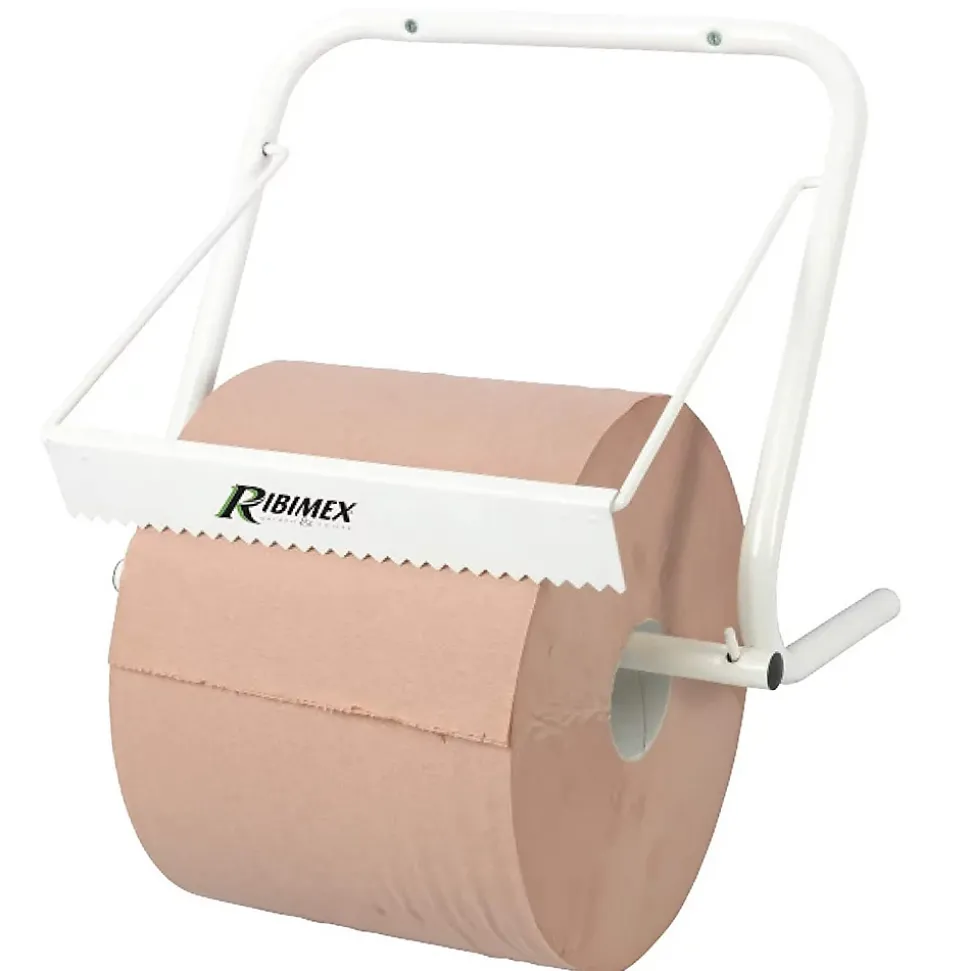 Dévidoir mural en acier mat blanc, compatible avec bobines d’essuyage jusqu’à 30 cm, livré sans papier, conditionné en colis de 10, adapté aux garages, chantiers et ateliers.