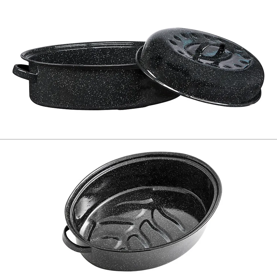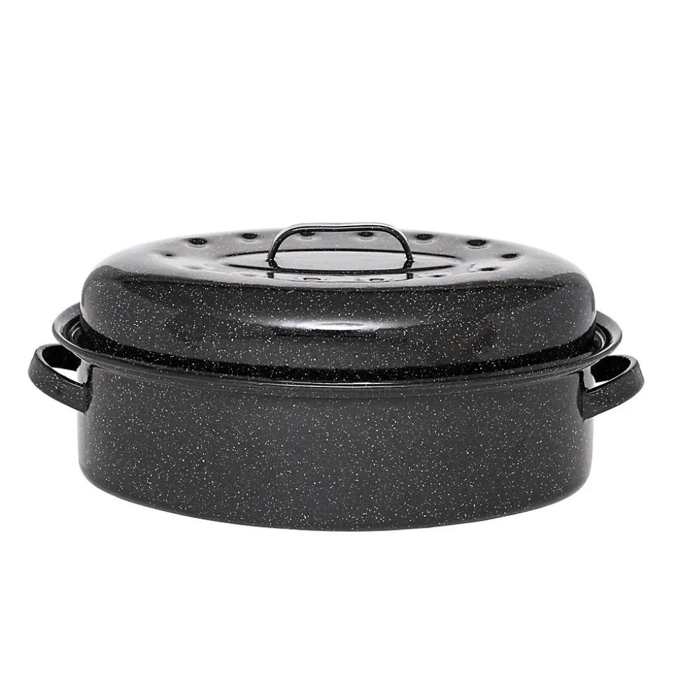 Roaster : la cocotte ultra légère!En optant pour cette cocotte de la marque Graniteware Made in USA, c’est l’assurance pour vous de faire l’acquisition d’un produit haut de gamme qui vous viendra en aide pour toutes vos préparations culinaires.En effet, cette cocotte grand format est conçue pour vous accompagner dans la cuisson de vos repas de fête, dinde, chapon ou encore de grands poissons. Très facile à manipuler, vous n’aurez aucun mal à l’utiliser et ne manquerez pas d’être séduit par la cuisson que vous obtiendrez.En effet, le couvercle bulle inclus dans le produit permet d’arroser les aliments tout au long de la cuisson afin de ne pas obtenir un aliment trop sec.Grâce à cette cocotte Roaster, votre four restera toujours aussi propre. Le couvercle vous protégera également des éventuelles projections qu’il peut y avoir lors de la cuisson et qui vous demandent ensuite du temps pour le nettoyage.Ajoutons également que ce produit peut être positionné dans le lave-vaisselle sans risquer de l’endommager. Un produit qui propose un excellent rapport qualité prix et qui vous permettra de cuisiner facilement tous les plats de votre choix, et cela peu importe la quantité désiré grâce son grand format.Ce nouveau revêtement comprenant l’émaillage et la vitrification de la cocotte renforce sa robustesse et lui offre un design plus attrayant et travaillé tout en fortifiant sa qualité. La roaster est compatible avec tous les feux y compris le four et les plaques induction. Il vous permet d’obtenir un cuisson diététique sans matière grasse.Collection : Cocotte Roaster Ovale Matière : Acier Couleur : Noir Longueur : 46.00 cm Largeur : 32.00 cm Hauteur : 20.00 cm