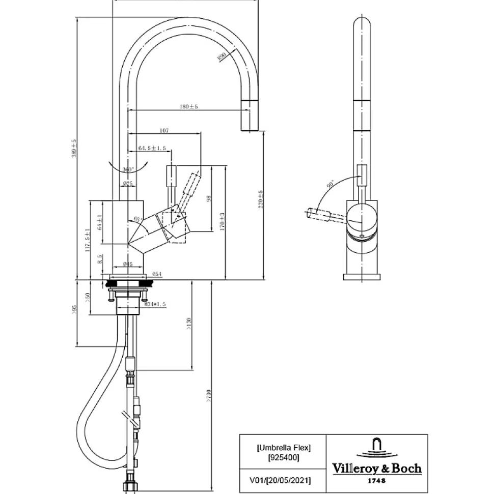 Avantages du robinet cuisine VILLEROY ET BOCH Umbrella flexHauteur offrant une grande liberté de mouvement, idéale pour faciliter le nettoyage et le remplissage de grands récipientsDouchette extractible pour une fonctionnalité optimale au quotidienJet confort ventilé, parfaitement calibré pour économiser l’eau tout en assurant un lavage efficacePivotement complet à 360° pour une flexibilité maximale sur l’évierRevêtement anti-traces et anti-tachesRobinet de cuisine en acier inoxydable, 100 % exempt d’acide, de goût et d’émissions, garantissant robustesse, durabilité et hygiène optimaleRevêtement PVD offrant une excellente résistance aux UV et aux chocsOuverture à froidCaractéristiques techniques du robinet cuisine VILLEROY ET BOCH Umbrella flexColoris : BronzeLongueur : 21,5 cmLargeur : 4,5 cmHauteur : 30,9 cmCollection : UmbrellaMatériau : acier inoxydableCartouche : plastique avec bague en céramiqueRayon de pivotement : 360°Angle d’ouverture du levier : 25°Débit du jet confort : 11,5 L/minFlexibles fournis : 60 cmType de pose : monotrouApplication : cuisineMatériau : acier inoxydableRevêtement : PVD résistant aux UV, aux chocs, anti-traces et anti-tachesCartouche : plastique avec bagues d’étanchéité en céramiqueFlexibles d’alimentation : fournis – longueur 60 cmFlexible de douchette : intégré et rétractable – longueur 180 cm