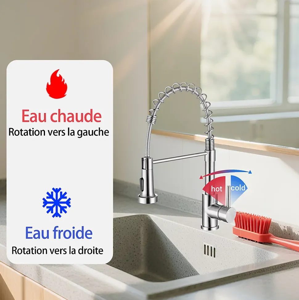 Robinet de cuisine avec douchette, Rotation 360, 2 jets, Finition brossée Acier Inoxydable 304, Pour évier standard