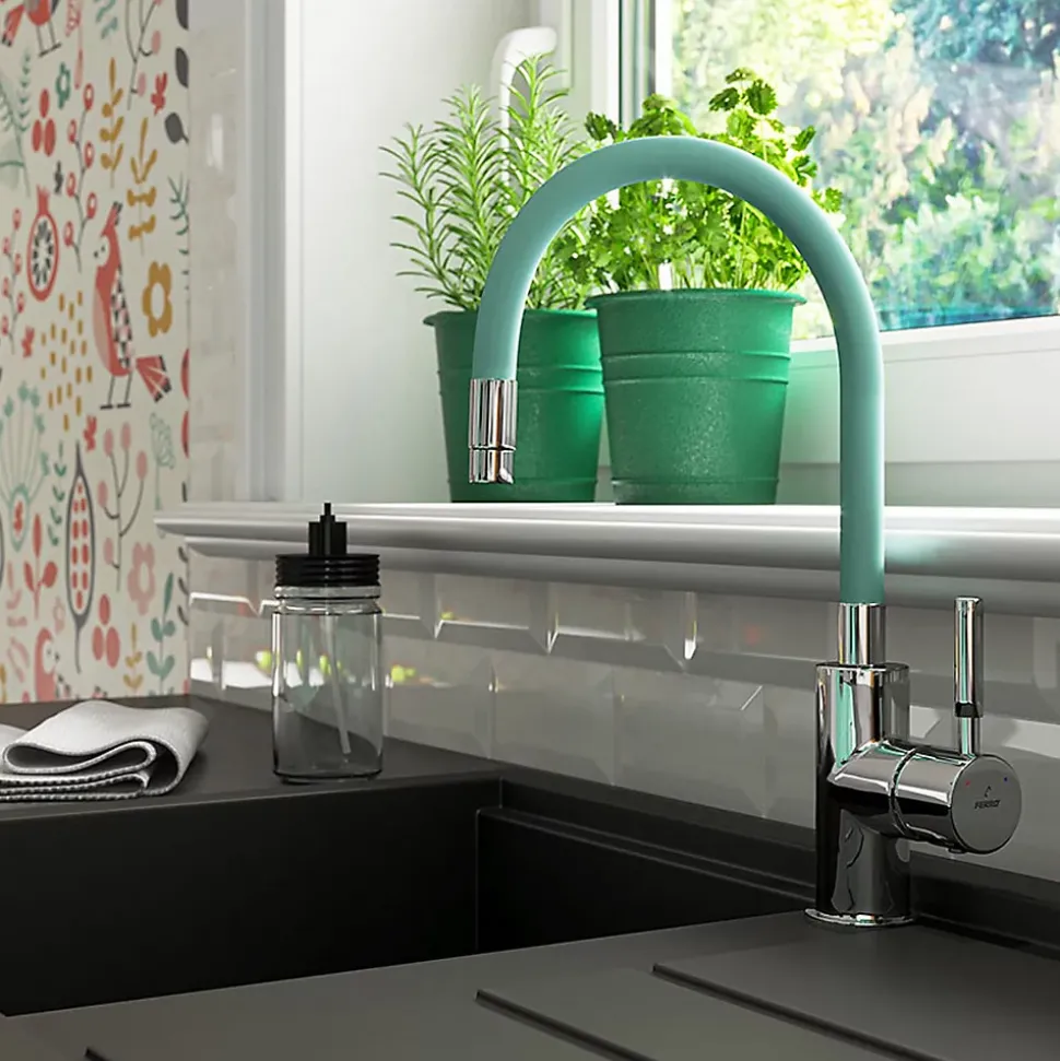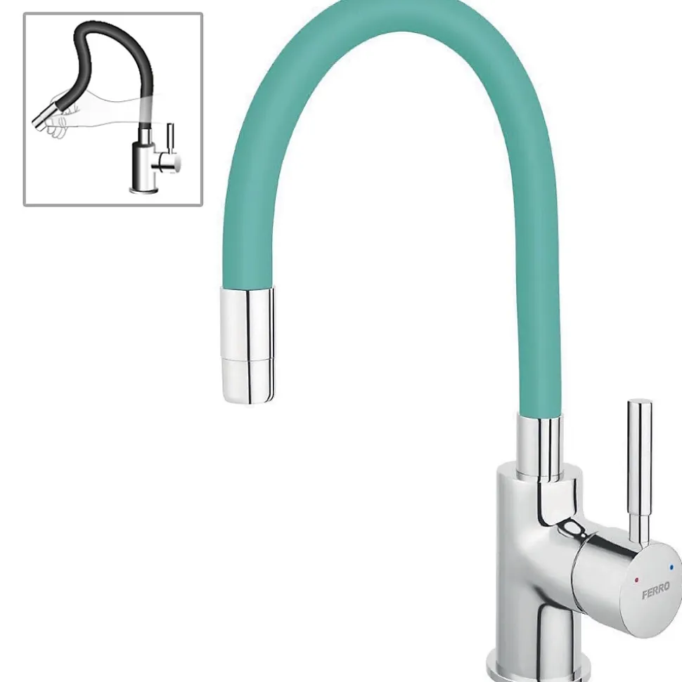 ZUMBA – ROBINET MITIGEUR DE CUISINE AVEC BEC ARTICULÉ ET FLEXIBLE BLEU MENTHE – Existe en différents coloris : gris, noir, blanc, bleu (menthe), jaune, vert et rouge. – Outre sa grande qualité de fabrication, ce robinet de cuisine présente de nombreux avantages dont celui d’offrir un bec à la fois flexible et articulé (mécanisme ingénieux, innovant et solide à l’intérieur du bec). Grâce à son bec articulé, vous pourrez non seulement le manipuler pour diriger le jet à votre convenance mais sa structure intérieure permet également d’adapter et de conserver la forme du bec dans la position voulue (comme une mémoire de forme). Le revêtement du bec est lui aussi de grande qualité (aspect doux et satiné). Un robinet qui se démarque par son rapport qualité / prix exceptionnel. – CARACTÉRISTIQUES – Marque : FERRO – Garantie : 5 ans – Levier de commande métallique – Finition : chrome brillant – Corps en laiton et bec flexible avec revêtement en caoutchouc robuste – Clapet anti-retour : oui – Couleur : bleu menthe – Corps du robinets rotatif – Fixation : monotrou Ø 35 mm standard – Robinet mitigeur à bec haut flexible, rotatif et amovible – Cartouche céramique avec système de contrôle du débit d’eau chaude – Aérateur FerroAirMix 24×1 avec système de détartrage facile – Kit de montage et flexibles d’alimentations (eau chaude / froide) G3/8 inclus – Hauteur du bec réglable : 28 à 44 cm – Largeur du bec réglable : 15 à 35 cm – Profondeur : 4,4 cm – Poids : 0,61 kg – INFOS LIVRAISON : livraison suivie par email et SMS. – A NOTER : pas de livraison en Corse ou sur les îles.