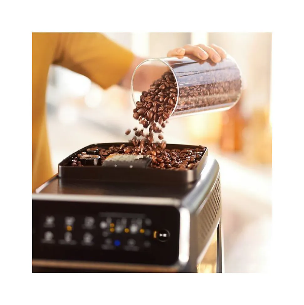 Machine à café entièrement automatique Philips EP2224.10 Série 2200. Préparez espresso, café et eau chaude avec une personnalisation facile via écran tactile. Broyeur en céramique 12 niveaux, mousseur à lait classique, filtre AquaClean pour 5000 tasses sans détartrage. Réservoir d’eau 1,8 L, bac à grains 275 g, groupe café amovible et nettoyage simplifié. Label énergétique A et design gris cachemire élégant. Puissance 1500 W, pompe 15 bars, garantie 2 ans.