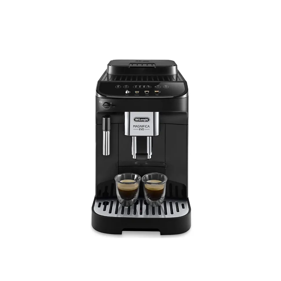 Robot café 15 bars noir Delonghi – Robot café MAGNIFICA EVO EOF6P46V de DelonghiLA NOUVELLE GAMME MAGNIFICA EVO :Magnifica Evo est la nouvelle gamme d’expresso broyeurs De’Longhi au design moderne pour habiller toutes les cuisines !INTERACTIVE :Son nouveau panneau de commande tactile avec icones colorés est intuitif et simple d’utilisation. Toutes les boissons sont en accès direct avec touches dédiées. Personnalisez l’intensité, la longueur en tasse et la température de toutes les boissons disponibles en toute simplicité.4 PRÉPARATIONS EN ACCÈS DIRECT :A chaque moment de la journée son café ! Magnifica Evo propose 3 recettes café différentes, chacune respectant une infusion spécifique et révélant des arômes différents. Mais également la préparation « vapeur et eau chaude » pour élaborer vos boissons en toute simplicité.ENTRETIEN SIMPLIFIÉ :Avec sa grille égouttoir amovible, entièrement démontable et compatible lave-vaisselle, pour un entretien toujours plus simple. – Type de produit : Broyeur café.Gamme : Magnifica Evo.Choix d’utilisation : café en grains ou moulu.Type de boissons : Expresso, Café, Long + Vapeur & eau chaude.Compatible café moulu et dosettes : Non.Puissance (W) : 1450.Pression (bar) : 15.Capacité du réservoir (L) : 1.8.Capacité bac à grains (g) : 250.Classement énergétique : A.Contenance du réservoir à marcs : 14 tasses.Bec verseur ajustable : Oui.Départ programmable : Non.Sélection du volume de café : Oui.Degré de mouture réglable : Oui (13 niveaux).Réglage intensité du café : Oui.Autre(s) fonction(s) : Pré infusion de la mouture, Dureté de l’eau programmable, Rinçage et détartrage en programmes automatiques, Fonction économie d’énergie.Ecran : Oui.Type d’écran : Commande intuitif et tactile avec icônes colorés.Arrêt automatique : Oui.Couleur : Noir.Dimensions (cm) : 24 x 44 x 36.Poids (kg) :