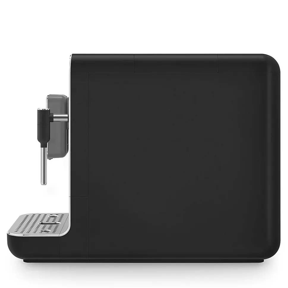 Robot café 19 bars noir Smeg – Machine à café automatique BCC12BLMEU de Smeg avec broyeur intégré. – Type : Machine à café automatique.Type : Avec broyeur intégré.Type de cafetière : Expresso café en grains.Type de commandes : Touches.Puissance (W) : 1350.Pression (bar) : 19.Nbre tasse(s) max. : 1.Capacité du réservoir de marc de café : 7.Système de chauffe : Thermoblock.Capacité du réservoir (L) : 1.4.Capacité bac à grains (g) : 150.Tension : 220-240 V.Fréquence : 50/60 Hz.Départ programmable : Non.Sélection du volume de café : Oui.Degré de mouture réglable : Oui.Nombre de boutons pour les boissons : 4Ecran : Non.Indicateur réservoir vide : Oui.Indicateur de détartrage : Oui.Bouton On-Off : Oui.Type de commande(s) : Touches.Arrêt automatique : Oui.Matériau du corps : Plastique.Matériau du panneau frontal : Aluminium.Couleur du panneau frontal : Aluminium.Finition du panneau frontal : Brossée avec bord poli.Couleur du distributeur : Noir.Matériau des touches : Plastique.Type de boissons : Ristretto, Expresso, Café, Eau chaude, Ristretto Léger, Espresso Léger, Café long, Fonction Vapeur.Compatible café moulu et dosettes : Non.Accessoire(s) inclus : Brosse de nettoyage, Bandelette de test de la dureté de l’eau, Brosse de nettoyage de la buse vapeur.Longueur du cordon (m) : 1.Finition / Nuance : Mat.Couleur : Noir.Couleur(s) secondaire(s) : Gris.Dimensions (cm) : 18 x 33.6 x 43.3.Poids (kg) : 8.4.