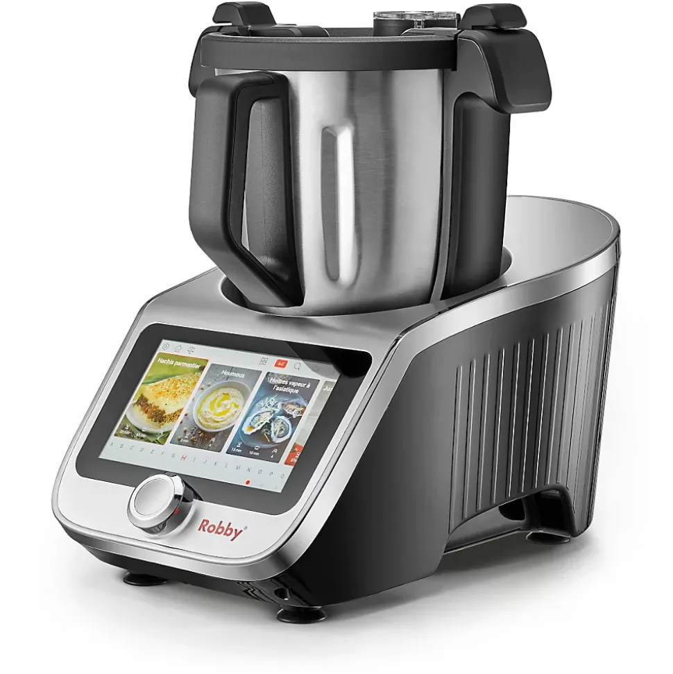 Robot cuiseur multifonctions connecté avec bol xl, balance intégrée et grand écran tactile +750 recettes Robby – Le RobiCook XL est le grand frère du Robicook, robot cuiseur multifonctions dernière génération de la gamme Robby !Conçu pour régaler toute la famille jusqu’à 8 personnes, plus de 750 recettes sont incluses : à réaliser en toute simplicité grâce à son écran tactile qui vous guide pas à pas !Une multitude d’accessoires sont inclus pour une infinité de recettes !La fonction pesée au gramme près est également incluse dans le RobiCook !Doté d’un grand écran couleur haute définition tactile et d’un bouton de navigation ergonomique, le RobiCook XL vous permettra de gérer facilement vos recettes.Vous naviguez facilement à travers toutes les recettes et fonctionnalités de l’appareil : apéritifs, entrées, soupes, plats de viande, plats de poisson, accompagnements, pâtes, riz et céréales, quiches, tartes et pizzas, sauces et dips, pains et viennoiseries, confitures et tartinades sucrées, desserts et crèmes, pâtisseries, boissons, recettes végétariennes, recettes express, recettes light…Équipé d’une véritable interface connectée, votre RobiCook XL se connecte au wifi pour bénéficier de mises à jour, ainsi que de nouvelles recettes par exemple ! Votre RobiCook XL ne cessera donc d’évoluer !Vous ne savez pas quoi cuisiner avec ce qu’il y a dans votre réfrigérateur ?Entrez le nom de l’aliment dans la barre de recherche et le RobiCook XL vous propose des recettes incluant cet aliment !Vous souhaitez retrouver facilement vos recettes préférées ?Ajoutez-les dans vos favoris afin de vous constituer votre bibliothèque de recettes personnalisées.Envie de plus de liberté ?Un mode manuel est également disponible dès l’allumage de votre appareil !Accédez rapidement aux programmes automatiquesAccès direct sur le menu de l’écran : pétrir, vapeur, mijoter, bouillir, mixer, râper/trancher et hacher…8 PROGRAMMES AUTOMATIQUESAccédez rapidement aux fonctions essentielles en