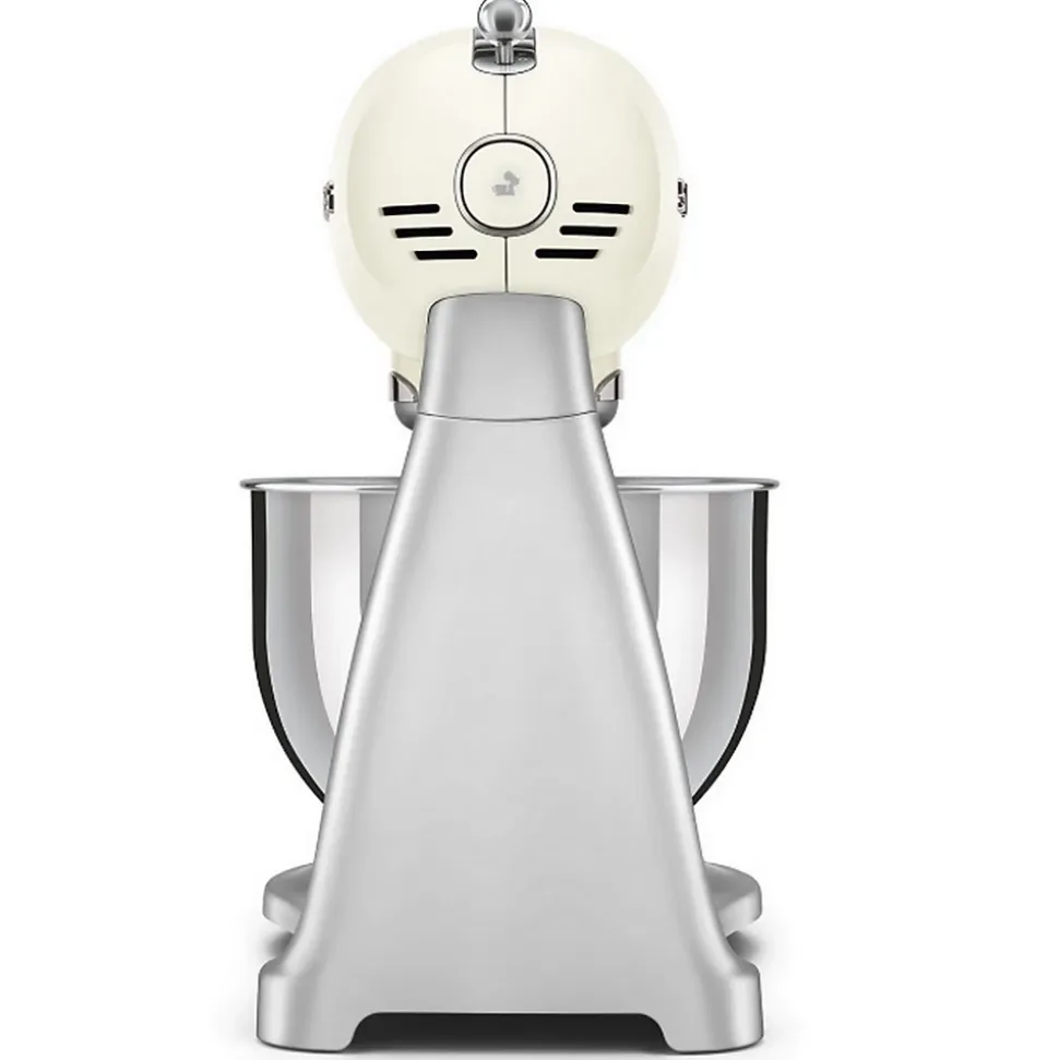 Robot pâtissier multifonctions 4.8l 800w crème Smeg – Robot sur socle Style des années 50 SMF04BLEU de Smeg.Le design de style années 1950 du batteur sur socle incarne à la fois la performance et l’élégance, servant d’outil fonctionnel qui apporte sophistication et style à la cuisine.Dix réglages de vitesse pour une adaptation optimale aux différentes consistances de pâte afin de garantir d’excellents résultats à chaque fois.Système de démarrage en douceur, pour un mélange parfait des ingrédients et moins d’éclaboussures.Moteur puissant et mouvement de rotation planétaire pour un mélange parfait des ingrédients.Utilisation polyvalente grâce aux trois accessoires inclus : fouet, batteur plat et crochet pétrisseur.Des sorbetières aux sets de pâtes, une large gamme d’accessoires disponibles séparément.Système de mélange stable : minimise les vibrations de la machine pendant le processus de mélange, permet une ouverture en douceur de la tête du moteur et l’empêche de se fermer accidentellement. – Type de produit : Robot sur socle.Esthétique : Style des années 50.Surface : Haute brillance.Niveaux de vitesse : 10.Puissance du moteur : 800 W.Capacité de remplissage maximale du bol de mélange : 4,8 L.Quantité max. de remplissage blancs d’œufs/œufs moyens : 12.Quantité minimale de remplissage blancs d’œufs/œufs de taille .moyenne : 2.Quantité max. de garniture de pâte feuilletée : 2,6 kg.Quantité max. de pâte à gâteau : 2,8 kg.Quantité max. de remplissage de pâte aux œufs : 500 g de pâte avec 5 œufs moyens.Quantité max. de remplissage de pâte à pain, à pizza ou à pâtes : 1,9 kg de pâte totale (max. 1,2 kg de farine/min. 55 % d’hydratation).Quantité max. de crème fouettée à remplir : 1 litre.Quantité minimale de garniture de crème fouettée : 100 ml.Couleur de la couverture avant (cicatrice) : Argent.Matériau de la couverture avant (grain) :