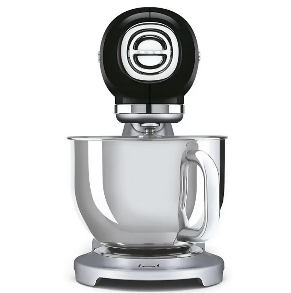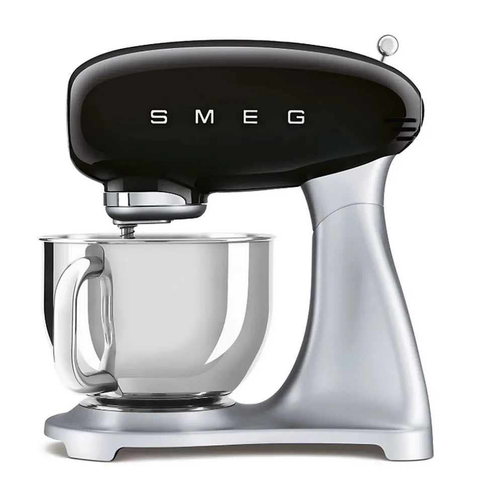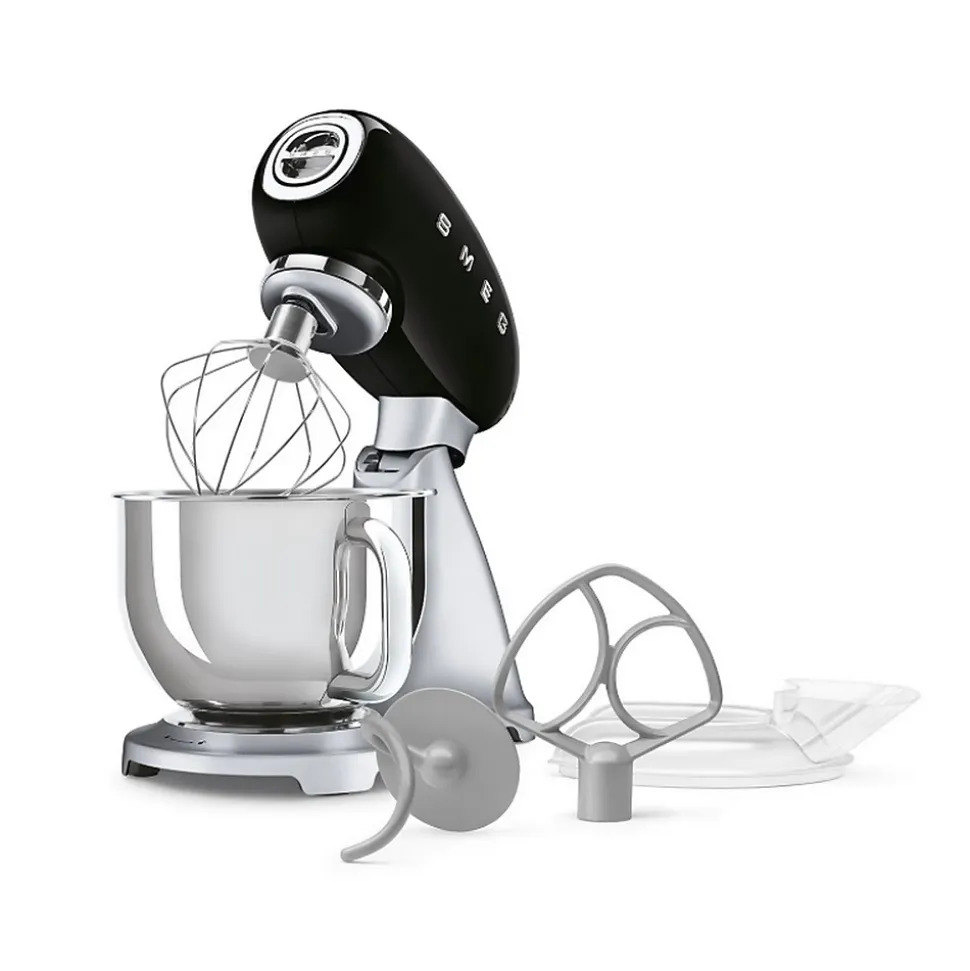 Robot pâtissier multifonctions 4.8l 800w noir Smeg – Robot sur socle Style des années 50 SMF04BLEU de Smeg.Le design de style années 1950 du batteur sur socle incarne à la fois la performance et l’élégance, servant d’outil fonctionnel qui apporte sophistication et style à la cuisine.Dix réglages de vitesse pour une adaptation optimale aux différentes consistances de pâte afin de garantir d’excellents résultats à chaque fois.Système de démarrage en douceur, pour un mélange parfait des ingrédients et moins d’éclaboussures.Moteur puissant et mouvement de rotation planétaire pour un mélange parfait des ingrédients.Utilisation polyvalente grâce aux trois accessoires inclus : fouet, batteur plat et crochet pétrisseur.Des sorbetières aux sets de pâtes, une large gamme d’accessoires disponibles séparément.Système de mélange stable : minimise les vibrations de la machine pendant le processus de mélange, permet une ouverture en douceur de la tête du moteur et l’empêche de se fermer accidentellement. – Type de produit : Robot sur socle.Esthétique : Style des années 50.Surface : Haute brillance.Niveaux de vitesse : 10.Puissance du moteur : 800 W.Capacité de remplissage maximale du bol de mélange : 4,8 L.Quantité max. de remplissage blancs d’œufs/œufs moyens : 12.Quantité minimale de remplissage blancs d’œufs/œufs de taille .moyenne : 2.Quantité max. de garniture de pâte feuilletée : 2,6 kg.Quantité max. de pâte à gâteau : 2,8 kg.Quantité max. de remplissage de pâte aux œufs : 500 g de pâte avec 5 œufs moyens.Quantité max. de remplissage de pâte à pain, à pizza ou à pâtes : 1,9 kg de pâte totale (max. 1,2 kg de farine/min. 55 % d’hydratation).Quantité max. de crème fouettée à remplir : 1 litre.Quantité minimale de garniture de crème fouettée : 100 ml.Couleur de la couverture avant (cicatrice) : Argent.Matériau de la couverture avant (grain) : Plastique.Matériau
