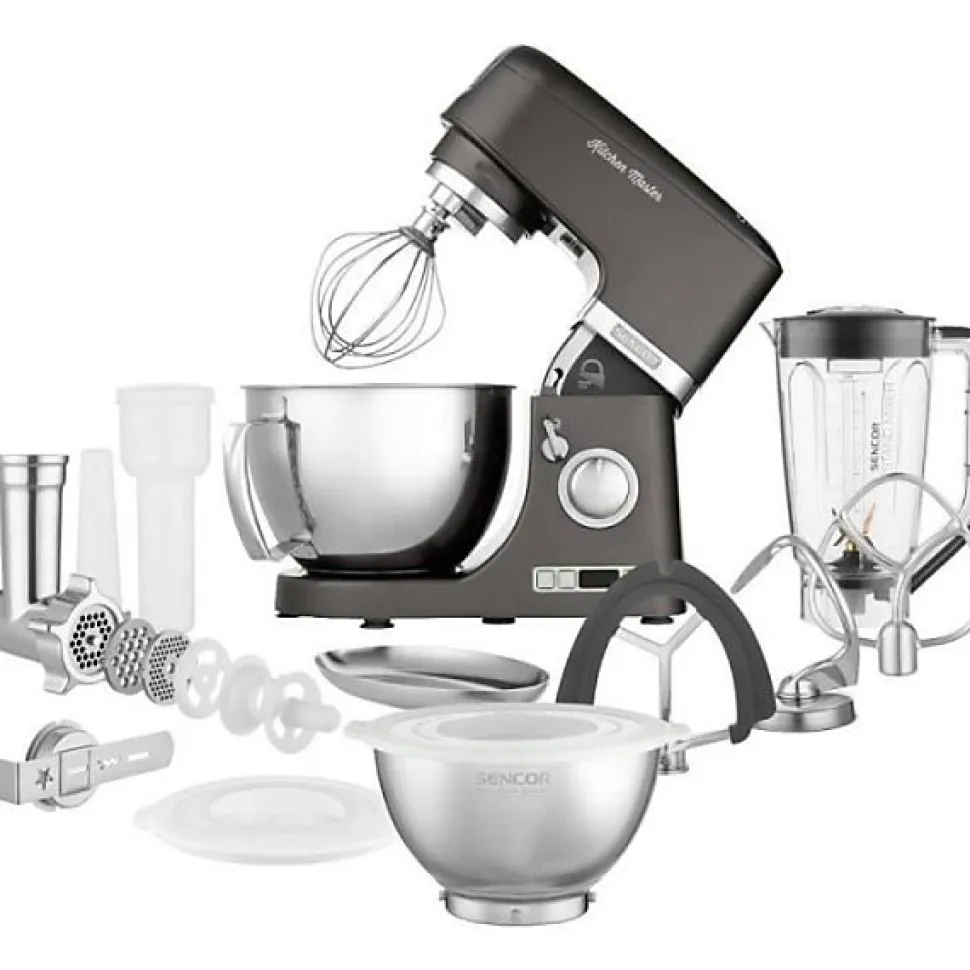 Robot pâtissier Sencor STM 7878BK : moteur 1000 W, bol inox 4,5 L, 8 vitesses avec fonction Pulse, affichage LED et éclairage du bol. Corps robuste en métal, accessoires multiples (pétrissage, fouettage, hachoir) et pièces compatibles lave-vaisselle.