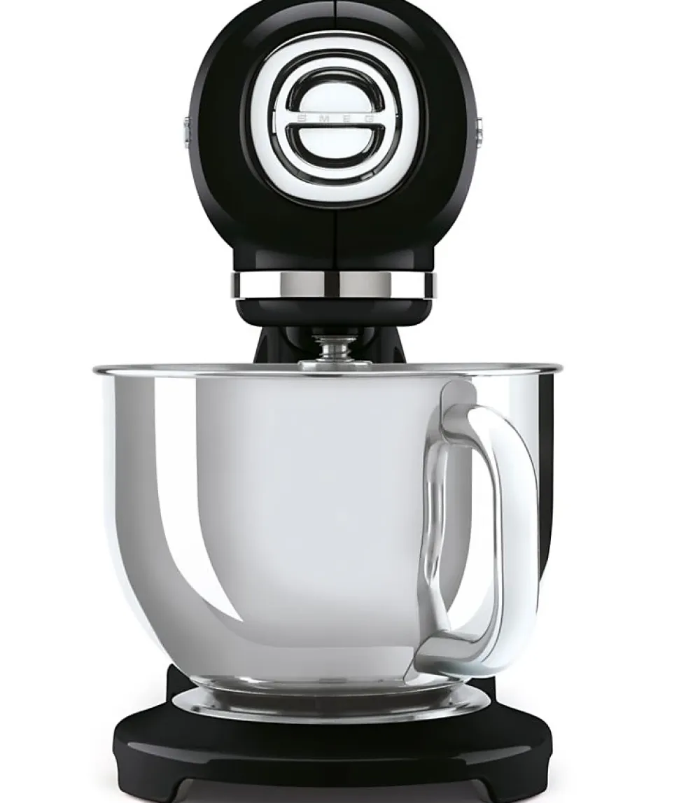 Robot sur socle 4.8l 800w noir Smeg – Robot sur socle Smeg SMF03BLEU en aluminium coulé vernis entièrement coloré. Base en alliage de zinc vernis. Levier de contrôle en acier inox. Bol de 4,8 litres et sa plaque de verrouillage en acier inox poli avec poignée ergonomique. Moteur à transmission directe. Mouvement planétaire. Protection surcharge moteur. Verrouillage commande lorsque la tête est relevée. Doté de 10 vitesses, avec mise en marche progressive. Sortie frontale pour accessoires. Range cordon intégré. Base antidérapante. – Type de produit : Robot pétrin.Matière corps : Aluminium.Matière bol : Inox.Capacité : 4.8 L.Nombre de vitesses : 10.Tension : 220-240 V.Fréquence : 50 Hz.Puissance : 800 W.Coloris : Noir.Capacité Farine standard : 1 Kg maximum.Capacité Farine intégrale : 0,8 Kg maximum.Capacité Blancs d’?ufs : 12 maximum, 2 minimum.Capacité Pâte pour tarte : 2,8 Kg maximum.Capacité Pâte pour pain, pizza, pâtes : 1,3 Kg maximum.Capacité Crème fouettée : 1 litre maximum.Longueur du câble : 1 m.Prise Schuko fournie.Accessoires fournis : Fouet à fils en acier inox, Batteur plat en aluminium, Batteur à bords flexibles en acier et silicone, Crochet pétrisseur en aluminium, Bol en acier inox de 4,8 litres et Couvercle verseur anti-projection.Dimensions (HxLxP) tête baissée : 378 x 402 x 221 mm.Dimensions (HxLxP) tête relevée : 490 x 402 x 221 mm.Poids net : 9.2 Kg.