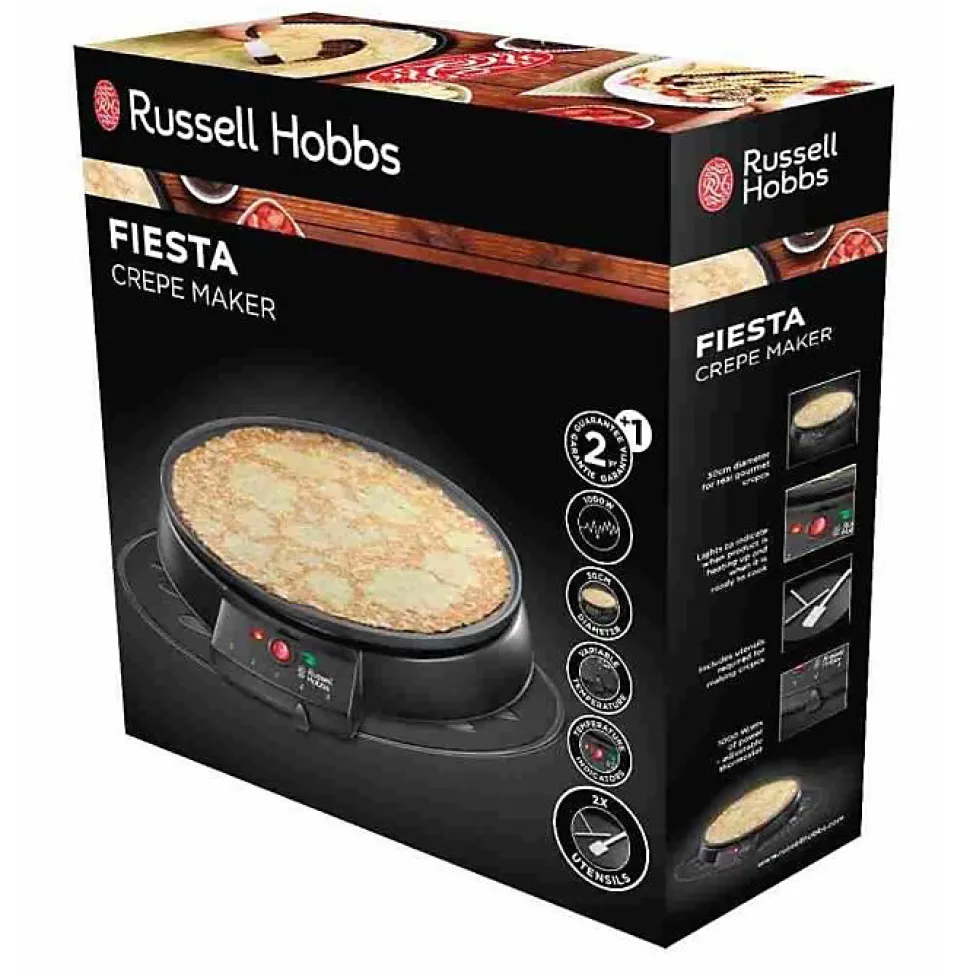 Crêpière électrique Russell Hobbs 30 cm, revêtement antiadhésif, thermostat 5 positions, 2 témoins lumineux, puissance jusqu’à 1200 W. Accessoires inclus : spatule et répartiteur. Patins antidérapants et rangement de cordon. Garantie 2 ans.