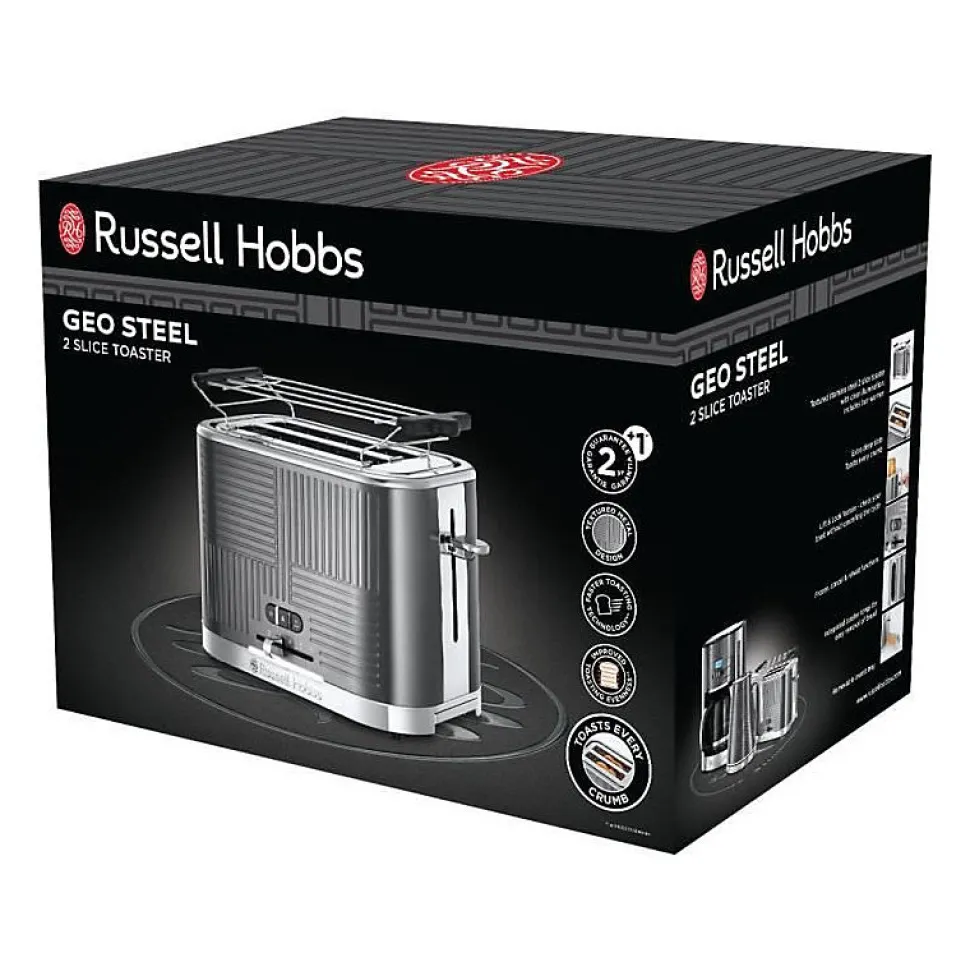 Russell Hobbs Geo Steel 25250-56, grille-pain deux tranches avec design géométrique moderne, acier inoxydable brossé, fonctions réchauffage, décongélation, annulation, large fentes pour pains épais, éclairage LED, puissance 2400W, tiroir ramasse-miettes amovible et pince incluse.