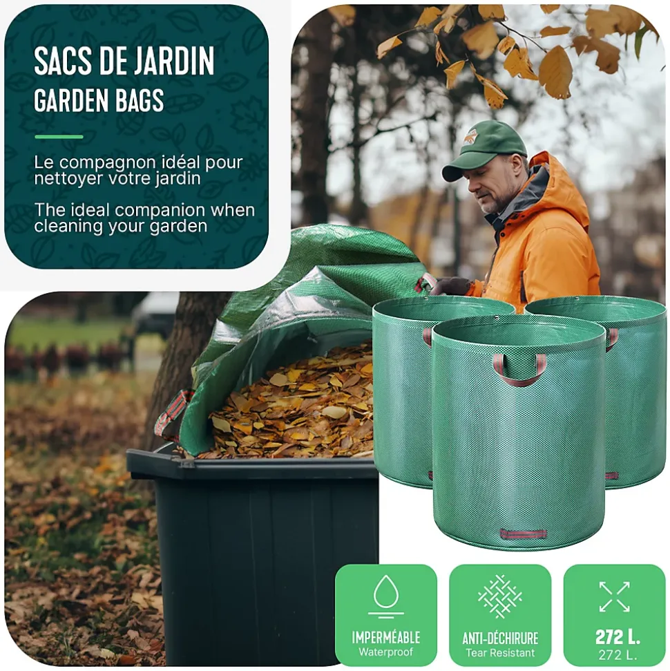 LES + PRODUITS Grande capacité de 272 L Résistants aux déchirures 3 poignées Facile d’utilisationDESCRIPTIONSACS DE JARDIN PLUS ÉPAIS ET PLUS RÉSISTANTSNos sacs déchets jardin sont fait en polypropylène durable et résistant (150gr/m2) et est anti-déchirure et résiste à l’humidité lorsque vous le remplissez avec de l’herbe ou de la terre mouillée.GRANDE CAPACITÉ DE RANGEMENTNotre sac de jardin a une capacité de 272 L qui peut supporter jusqu’à 80 kg d’herbes ou branches.RÉUTILISABLERamassez les feuilles et les déchets de votre jardin grâce à ce sac à déchets.FACILE À LEVER ET À VIDERLes 3 poignées situées sur les côtés permettent un transport et un vidage facile.MAINTENIR OUVERTLe cerclage plastique situé à l’ouverture du produit permet aux sacs de tenir debout et ouverts.CARACTÉRISTIQUES Taille : 67x76cm Capacité : 272 Litres/72 Gallons Matière : Polypropylène-150gr/m2► Attention : Attention de ne pas laisser les sacs de jardin exposé au soleil trop longtemps. Cela peut réduire la durée de vie du produit.► Conseil : Pour l’herbe tondue, les racines ou la terre mouillée, il est recommendé de ne remplir le sac qu’à moitié avec un poids raisonnable afin de ne pas vous faire mal au dos.IMPORTANT :Les livraisons se font en France métropolitaine à l’exception des îles qui ne sont pas reliées au continent par un pont (Corse, Ile d’Yeux etc.) et des DOM-TOM.