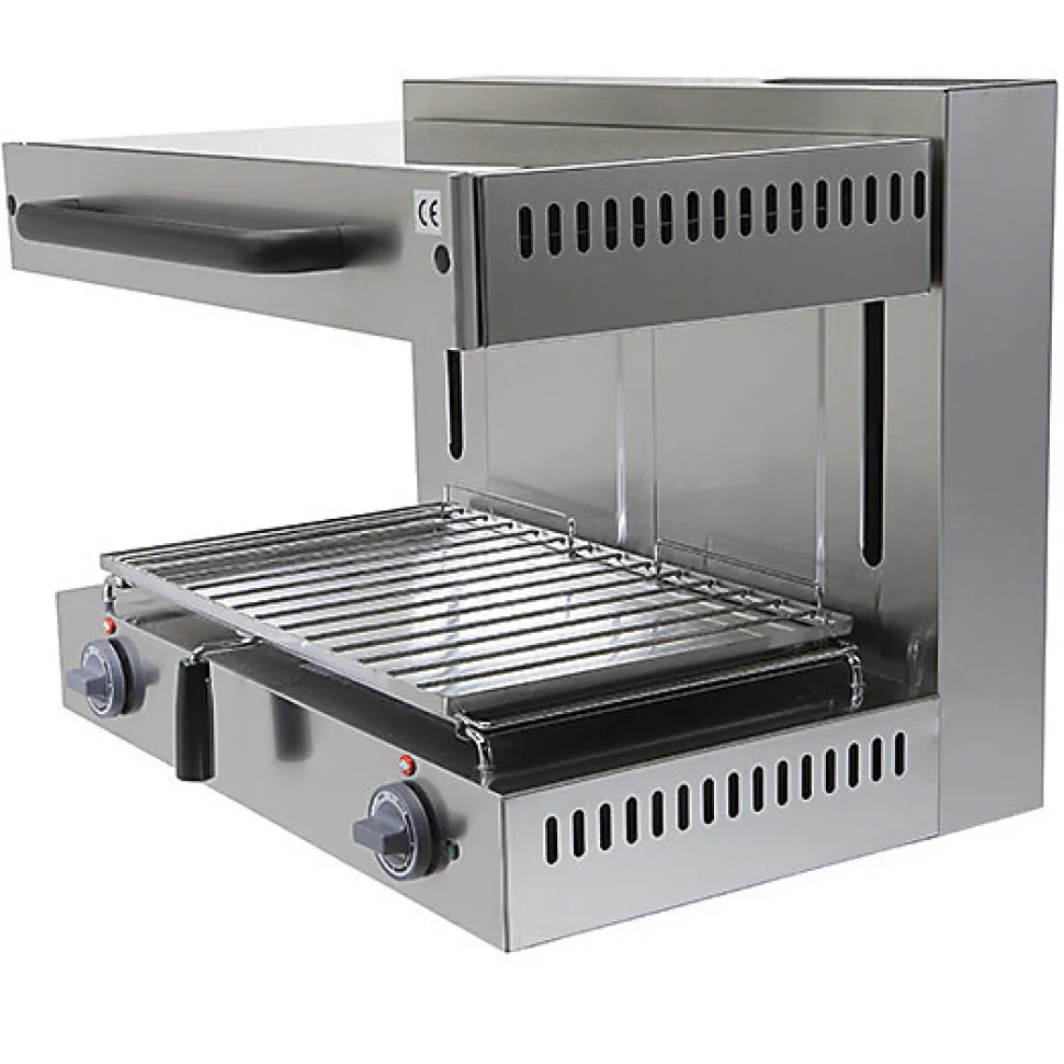 Salamandre gaz pro » Salamandres mobiles en acier inoxydable 18/10 ; la partie supérieure chauffante est réglable en hauteur pour régler la distance entre les aliments et la zone de chauffe Grille GN 1/1 en inox chromé Bac récupérateur de graisses inox fixe dans cadre non basculant Équipé d’une veilleuse inox pour allumage piézoélectrique placé en partie haute Alimentation en gaz et soupape de sécurité avec thermocoupleCaractéristiques techniques :Dimensions (mm) : L680 P500 H500Poids (kg) : 72Énergie : GazCapacité : surface de cuisson 530x 325 mmnAlimentation gaz 1/2″