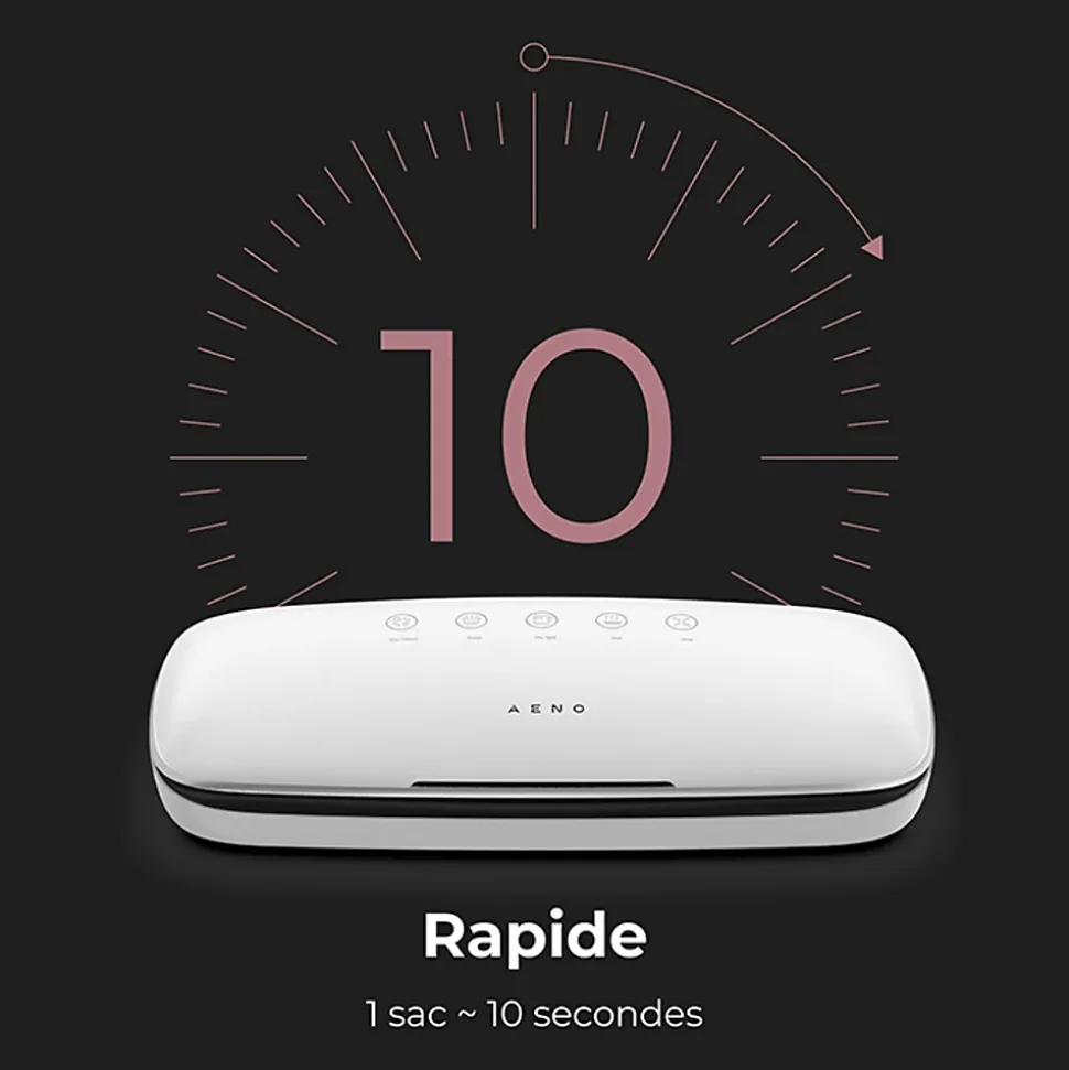 La marque :AENO est une marque d’appareils électroménagers intelligents offrant des produits de haute qualité, un service client et un design innovant. Description produit :Le scelleur sous vide AENO VS2 conserve vos aliments plus longtemps tout en économisant de l’espace. Avec ses différents modes et accessoires, il simplifie la conservation et la préparation des repas. Caractéristiques Principales : Conservation : Prolonge la fraîcheur jusqu’à 5 fois plus longtemps. Puissance : Aspiration de 75 kPa, débit 4,5 L/min. Polyvalent : Pour aliments secs et humides. Modes : Impulsion, aspiration & scellage, scellage seul. Indicateurs LED : Rouge pour sec, bleu pour humide. Utilisation : Fonctionnement à une touche, bouton d’arrêt rapide. Design compact : Facile à ranger.Spécifications : Puissance : 75 kPa Débit : 4,5 L/min Sacs jusqu’à 30 cm de largeInclus : Adaptateur pour conteneur, 10 sacs (5 x 15 cm × 20 cm, 5 x 20 cm × 30 cm) Temps de Scellage : 10 sec par sac