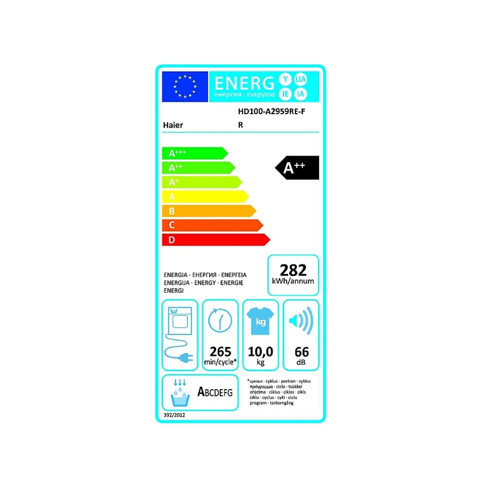 Sèche-linge à condensation 60cm 10kg Haier – Sèche-linge hublot I-Pro Series 5 HD100-A2959RE-FR de Haier.Pompe à chaleur : La technologie pompe à chaleur conserve la chaleur à l’intérieur du tambour de votre sèche-linge, réduit la consommation d’énergie et garantit un meilleur entretien de votre linge par rapport à un sèche-linge ordinaire.Programme I-Refresh :Le programme I-Refresh vous permet de rafraichir, retirer les poussières et désodoriser vos vêtements en 30 minutes !Fonction hygiènique :Grâce à cette fonction, le sèche-linge Haier est capable d’éliminer plus de 99 % des bactéries présentes sur les vêtements.Départ différé :Grâce à cette fonction, le sèche-linge Haier est capable d’éliminer plus de 99 % des bactéries présentes sur les vêtements.Eclairage du tambour :Plus besoin de chercher les chaussettes perdues : grâce à l’éclairage intérieur du tambour, vous pouvez charger et décharger votre linge facilement sans rien laisser derrière.Connectivité :Plus besoin de chercher les chaussettes perdues : grâce à l’éclairage intérieur du tambour, vous pouvez charger et décharger votre linge facilement sans rien laisser derrière. – Type de produit : Sèche-linge frontal.Gamme : I-Pro Series 5Capacité linge : 10 kg.Volume bac (L) : 5.Classe énergétique : A++.Classe taux de condensation : A.Conso. d’énergie annuelle totale : 282.Conso. cycle (kWh) : 2.43.Niveau sonore (dB) : 66.Volume tambour (L) : 118.Nombre de programmes : 12.Type de séchage : Pompe à chaleur.Sèche-linge connecté : Oui.Type de connectivité : App hOn + WiFi + Bluetooth.Coton : Oui.Synthétiques : Oui.Délicat / Fragile : Oui.Rapide : Oui.Laine : Oui.Sport / Fitness : Oui.Programmes spéciaux : Couette, Mixte, Serviette.Départ différé : Oui.Type de départ différé : 1-24 h.Anti-froissage fin de cycle : Oui.Réglage du °C de
