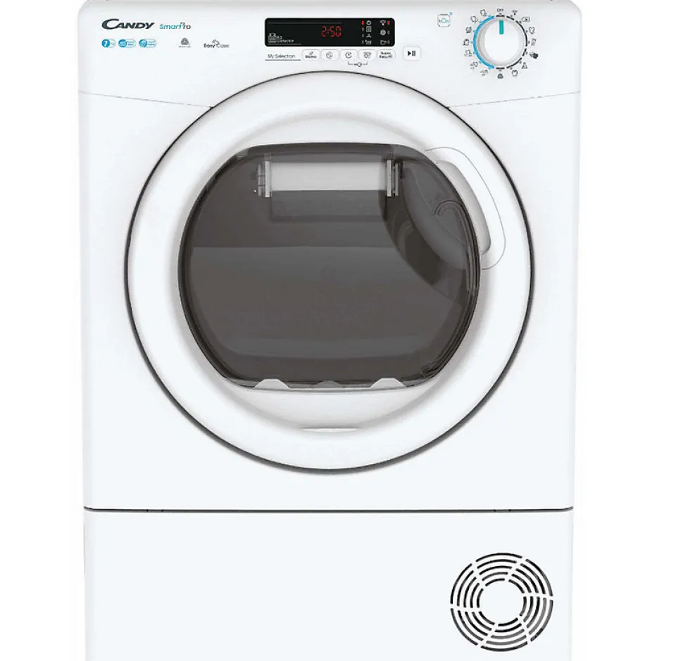 Sèche-linge Candy CSO4H7A2DES à condensation avec pompe à chaleur, capacité 7 kg et volume tambour de 99 L. Classe énergétique A++, connectivité WiFi + Bluetooth, 14 programmes, démarrage différé jusqu’à 24 h, bac EasyCase pour récupération d’eau facile, niveau sonore 67 dB, pose libre, finition laquée blanche, dimensions compactes (59.6 cm largeur, 46.5 cm profondeur, 85 cm hauteur).