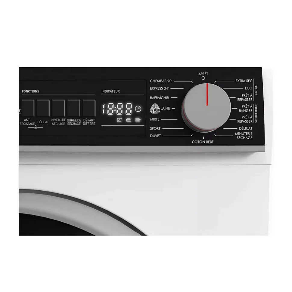 Sèche-linge pompe à chaleur 60cm 8kg Sharp – Sèche-linge KDNHB8S7GWD de Sharp.Pompe à chaleur : Préservez vos vêtements et faites des économies d’énergie grâce au sèche-linge pompe à chaleur.Tambourinox : Un tambour en inox avec une durée de vie prolongée grâce à sa conception anti-corrosion.Wave Cabinet : Un système anti-vibrations grâce à une paroi spécialeen forme de vague.Bubble Drum : Protégez vos vêtements grâce au tambour à bulles qui limite le frottement du linge.8 capteurs de sécurité : Utilisez votre appareil en toute tranquillité grâce aux 8 capteurs de sécurité.Sonde d’humidité :Bénéficiez d’un séchage précis et uniforme en un temps optimal. – Type de produit : Sèche-linge.Construction : Pose libre.Type de séchage : Pompe à chaleur.Type de moteur : PSC.Volume du tambour (L) : 112.Capacité (kg) : 8.Classe énergétique : D.Niveau sonore séchage (dB) : 64.Consommation d’énergie annuelle (kWh) : 119.Courant électrique (A) : 10.Tension (V) : 220-240.Fréquence (Hz) : 50.Efficacité condensation : 82%.Technologie de séchage : 8 capteurs.Système de contrôle : Electronique.Type de porte : En verre – 47 cm.Matière de la cuve : Inox.Éclairage LED : Oui.Tambour Bubble Drum : Oui.Rotation à double sens : Oui.Affichage : Led blanc.Nombre de programmes : 15.Programme 1 : Coton Extra sec.Programme 2 : Coton Prêt à ranger.Programme 3 : Coton Prêt à repasser.Programme 4 : Synthétiques Prêt à ranger.Programme 5 : Synthétiques Prêt à repasser.Programme 6 : Délicat.Programme 7 : Mix.Programme 8 : Coton Bébé.Programme 9 : Couette.Programme 10 : Sport.Programme 11 : Temps de séchage.Programme 12 : Rafraichissant.Programme 13 : Rafraichissant laine.Programme 14 : Express 34 min.Programme 15 : Chemises 20 min.Départ différé : Oui